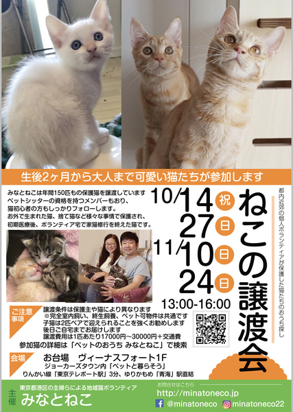 | イベント内容 | 東京都港区を中心に年間150匹以上の譲渡を行なっている、みなとねこがお台場で譲渡会を開催します。 都内近郊のボランティアさんが保護した可愛い子猫たちや飼いやすい大人猫が集合します。 毎月1-2度のペースで開催していましたが9月は3回開催予定です。 おかげさまで毎回素敵なご縁に恵まれております。 8月9月も50匹以上の猫たちにずっとのお家が見つかりました。 まだまだ子猫がたくさんいます。 参加予定猫はいつでも里親募集中とFacebookページでご紹介します。 https://m.facebook.com/minatoneco/ 是非会いに来てくださいね。 |