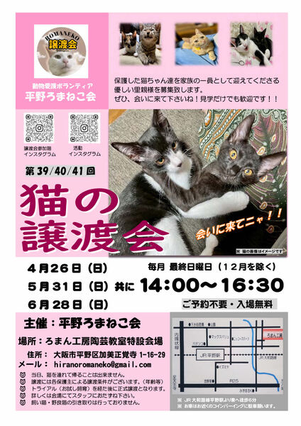 | イベント内容 | 「第39回 平野ろまねこ譲渡会」を開催致します。 春真っ盛りで猫も真っ盛り! かわいい子猫から落ち着いた大人猫までが参加します! ベテランの保護主が、参加猫達のケアや人馴れ修業を施して皆様とのご縁をお待ちしています。見学だけでも歓迎!皆様のお越しをお待ちしております! (会場入口で手指の消毒をお願いします。譲渡は各保護主(団体)により譲渡条件が若干異なります。会場でスタッフにおたずね下さい。) ●毎月 最終日曜日に開催(12月はお休み) ●ご予約不要・入場無料 ●JR平野駅北出口下車、東へ徒歩7分 ●お車では近隣のコインパーキングをご利用下さい。会場前には路上駐車しない様お願い致します。 ●活動インスタグラム https://www.instagram.com/romanekokai/ ●譲渡会参加猫インスタグラム https://www.instagram.com/romaneko_jyotokai/ ●メール hiranoromaneko@gmail.com |