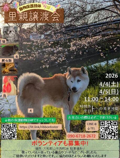 | イベント内容 | りぼんは、奈良県に拠点を置く動物保護団体です。 犬・猫・うさぎなどの小動物・インコやニワトリなどの鳥・両生類・爬虫類など動物種を問わず、お届け先も地域を問わず、動物たちと里親さまをつなぐ活動を行っています。 ◎ホームページ https://ribbon-foster.jimdofree.com/ ◎YouTube https://www.youtube.com/@ribbon-shelter https://www.instagram.com/ribbon_shelter1/(里親募集中の動物たち) https://www.instagram.com/ribbon_shelter/(ボランティア日記) |