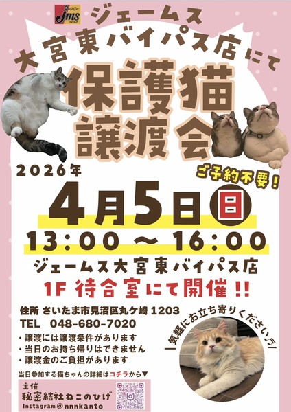 | イベント内容 | 4/5(日)13:00~16:00は♪ ジェームス大宮東バイパス店 〒337-0001 埼玉県さいたま市見沼区丸ヶ崎1203 にて♪ 秘密結社ねこのひげ 保護猫譲渡会を開催します☆ カー用品を見に来たらば… 保護猫譲渡会をやっててビックリ! (⊙⊙)ファッ!? 車のメンテナンスに来たらば… 保護猫がいぱーーい♪で (*´Д`*)ハァハァ♡ 新しい家族を探しに来たらば… 出逢っちゃった♡ (o・ω[+]ロックオン!! などなど♪ お迎え目的の方はもちろんのこと そうでない方も!! 是非お気軽にお立ち寄りくださいませ☆ (ΦωΦ)ココロヨリオマチシテマース♡ ご不明な点がございましたら インスタグラム @nnnkanto 秘密結社ねこのひげ の DMまでお問い合わせ下さい☆ |