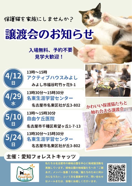 | イベント内容 | 日時 4月12日(日) 13:00〜15:00 場所 愛知県みよし市福谷町竹ヶ花9−1 アクティブハウスみよし 主催 愛知フォレストキャッツ 地域猫活動やTNR活動の過程などで 保護した猫たち たくさんの猫たちが参加します 見学、相談だけでも大丈夫! 予約不要、参加費無料なのでお気軽に 猫に関する活動を何かしたい、という方も歓迎です 遊びに来る感覚で、お越しくださいませ |