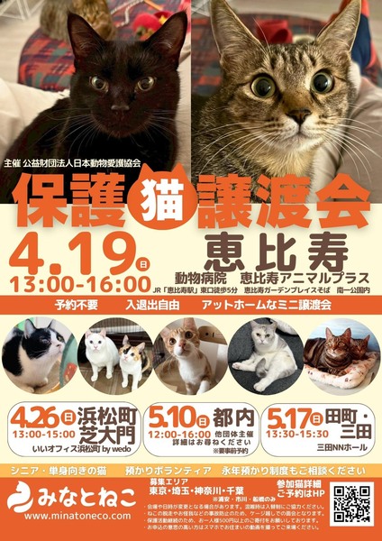 | イベント内容 | ~~~~~~~~~~~~~~~ 【 4/19(日) 恵比寿】で行われる公益財団法人日本動物愛護協会主催の保護猫譲渡会に参加予定です。 会場:動物病院 恵比寿アニマルプラス JR山手線「恵比寿駅」東口徒歩5分※恵比寿ガーデンプレイスそば 住所:東京都渋谷区恵比寿南1-26-1 恵比寿南一公園内2F 日時: 4/19(日)13:00-16:00 ※予約不要・入退場自由 お気軽にご参加ください。 ※なるべく多くの方にご参加いただけるよう、運営にご協力ください ※当日、里親のお申し込みをご希望の方はぺットのおうちのフォームより気になる猫へお問い合わせあまたは里親申込をお願いします。 ※「申込相談」の事前連絡がない方は、申込書類をお持ち帰りいただき、後日LINEなどでヒアリングなどさせていただきます。 ※当日、空きがあれば「申込相談」をご案内できる場合もあります。 「譲渡会=その場で決断」ではなく、 猫と人の相性を大切に、じっくりご縁をつなぐ場としてお気軽にお立ち寄りください。 ↓詳細はこちら https://www.minatoneco.com/event/ebisu ~~~~~~~~~~~~~~~ |