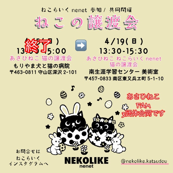 | イベント内容 | ねこらいくnenet主催 保護猫の譲渡会^._.^ 3団体合同譲渡会です! 〇予約・入場料不要〇 実際に猫を見てから考えたい飼育の仕方について質問したい・・・などすぐに決められない方でも結構です。 ぜひ、お気軽に譲渡会へおこしください♪ ○保護主により譲渡条件が異なりますのでご確認ください 〇室内飼い、家族全員の同意、治療費の負担などお願いごとがあります 〇1~2週間のお試し飼育期間があります 〇当日、猫を連れて帰ることはできません *参加予定猫が急な体調変化により会場に来れない場合もあります。ご了承いただきますようお願いします。 参加ボランティア(五十音順) あさひねこ @owariasahineko 動物保護施設FAM @animalshelter.fam ねこらいくnenet @nekolike.katsudou 【南生涯学習センター】 市バス「日本ガイシスポーツプラザ」下車 北へ約500m JR「笠寺」下車 西へ約500m ※車でお越しの方へ 南生涯学習センター駐車場が満車の場合は、隣接する南保健センター駐車場をご利用ください(駐車後、生涯学習センター受付で料金支払い300円)。 どちらも満車の場合は、日本ガイシホール駐車場か周辺のコインパーキングのご利用をお願いいたします。 |
