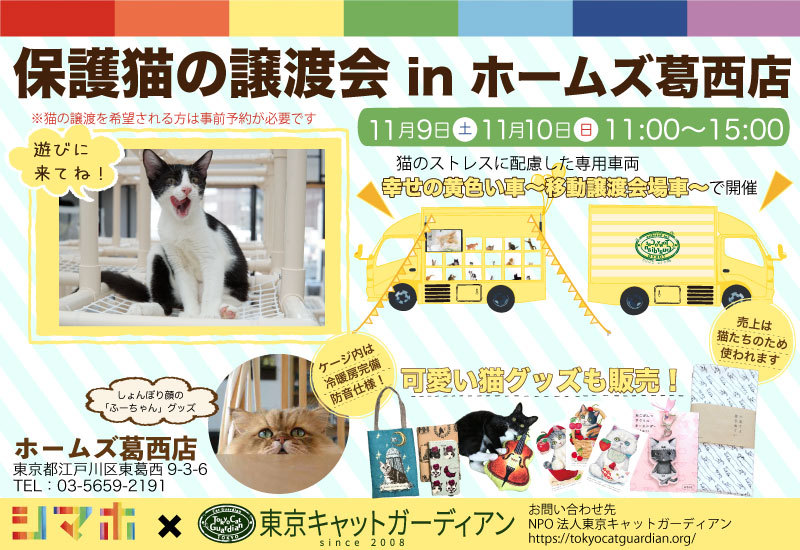 | イベント内容 | 幸せの黄色い車~移動譲渡会場車~ inホームズ葛西店 幸せの黄色い車~移動譲渡会場車~がホームズ葛西店さんにやってきます! 猫のメンタルに配慮した、特別仕様の車です。 ケージ内は冷暖房完備・防音仕様の「幸せの黄色い車」の詳細についてはコチラ! https://tokyocatguardian.org/yellow_car/ 開催日は、twitterでも黄色い車で寛ぐ猫たちの写真を公開★ 猫たちに会いに来ていただけること 猫グッズ購入で支援してくださること 幸せの黄色い車を見に来ていただけること 全てがご支援になります。 お友達と、お誘い合わせの上ぜひよろしくお願いいたします! 会場では、可愛い猫グッズも販売します! しょんぼり顔のふわふわ猫、ふーちゃんのオリジナルグッズも限定発売★ 「子猫の家族になりたい」「可愛い猫グッズが欲しい」「遊びに行くことで支援したい」 という方は是非いらしてください! ★猫の里親になるには事前申し込みが必要です★ 申し込みはコチラ https://tokyocatguardian.org/cats_event/ 【会場案内】 ホームズ葛西店 様 〒134-0084 東京都江戸川区東葛西9-3-6 google map:https://goo.gl/maps/mfAW1WZqhBz (アクセス) ・電車 JR京葉線葛西臨海公園駅より徒歩約20分 ・電車+バス 東京メトロ東西線「葛西駅」 →都営バス9番のりば 葛西21系統 →「東葛西8丁目」下車 徒歩すぐ JR京葉線「葛西臨海公園駅」 →都営バス3番のりば葛西21系統 →「東葛西8丁目」下車 徒歩すぐ ・車 大型駐車場完備 料金:無料 |