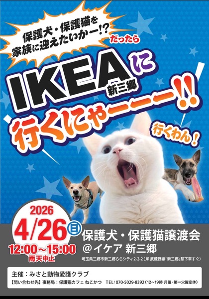 | イベント内容 | 4月6日(日)開催のIKEA船橋に続き、 保護犬保護猫譲渡会in IKEA新三郷 今年も開催いたします! 2026年4月26日(日) 12時~15時 会場 IKEA新三鄉エントランス前広場 主催 みさと動物愛護クラブ ※ 外会場のため雨天中止になります 問い合わせ先 保護猫カフェ ねこかつ 複数の団体、ボランティアが参加する大きな譲渡会です。 ぜひぜひお越しくださいm(_ _)m #IKEA新三郷#保護犬譲渡会 #保護猫譲渡会 *…..*…..*…..*…..*…..*…..*…..*…..*…..*….*…..*…..*…..* しっぽたちの物語 Instagram https://www.instagram.com/sippotatinomonogatari?igsh=MXVkbzh3d3lnNzloOA== *…..*…..*…..*…..*…..*…..*…..*…..*…..*….*…..*…..*…..* |