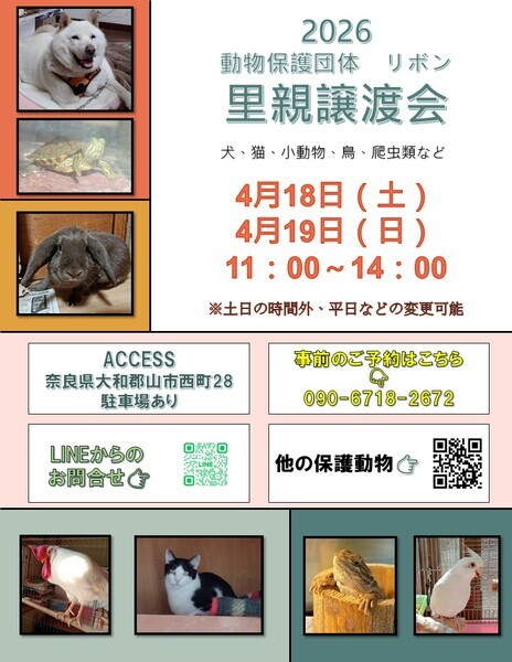 | イベント内容 | りぼんは、奈良県に拠点を置く動物保護団体です。 犬・猫・うさぎなどの小動物・インコやニワトリなどの鳥・両生類・爬虫類など動物種を問わず、お届け先も地域を問わず、動物たちと里親さまをつなぐ活動を行っています。 ◎ホームページ https://ribbon-foster.jimdofree.com/ ◎YouTube https://www.youtube.com/@ribbon-shelter https://www.instagram.com/ribbon_shelter1/(里親募集中の動物たち) https://www.instagram.com/ribbon_shelter/(ボランティア日記) |