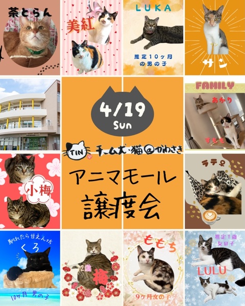 | イベント内容 | ★川崎市動物愛護センター(アニマモールかわかき)1階 南武線平間駅下車徒歩10分位 お車でお越しの方はセンター敷地内無料駐車場がご利用できます。 快適な室内でゆっくり保護猫さんに会えますので是非お立ち寄りください! ●第1日曜日・第3日曜日は定例【アニマモール譲渡会】開催します!! 4月5日(日)アニマモール譲渡会 13時−16時 開催!無料駐車場あり 4月19日(日)アニマモール譲渡会 13時−16時 開催!無料駐車場あり ●第2日日曜日・第4日曜日は定例【溝の口譲渡会】開催します! 4月12日(日)溝の口譲渡会 13時−16時 4月26日(日)溝の口譲渡会 13時−16時 ★譲渡会参加猫さんは➡️『チーム犬・猫@かわさき』ホームページ/インスタグラムURL★ ご確認ください。 https://teaminuneko-kawasaki.org/ https://www.instagram.com/team.inuneko.kawasaki/?utm_source=ig_embed&ig_rid=bbc4c879-2a7f-4051-bf97-945b15c5299f |