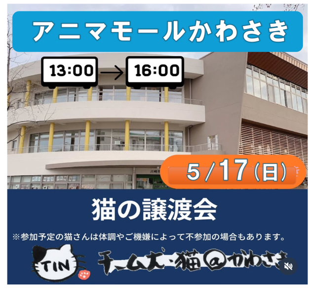 | イベント内容 | ★川崎市動物愛護センター(アニマモールかわかき)1階 南武線平間駅下車徒歩10分位 お車でお越しの方はセンター敷地内無料駐車場がご利用できます。 快適な室内でゆっくり保護猫さんに会えますので是非お立ち寄りください! ●第1日曜日・第3日曜日は定例【アニマモール譲渡会】開催します!! 5月3日(日)アニマモール譲渡会 13時−16時 開催!無料駐車場あり 5月17日(日)アニマモール譲渡会 13時−16時 開催!無料駐車場あり ●第2日日曜日・第4日曜日は定例【溝の口譲渡会】開催します! 5月10日(日)溝の口譲渡会 13時−16時 5月24日(日)溝の口譲渡会 13時−16時 ★譲渡会参加猫さんは➡️『チーム犬・猫@かわさき』ホームページ/インスタグラムURL★ ご確認ください。 https://teaminuneko-kawasaki.org/ https://www.instagram.com/team.inuneko.kawasaki/?utm_source=ig_embed&ig_rid=bbc4c879-2a7f-4051-bf97-945b15c5299f |