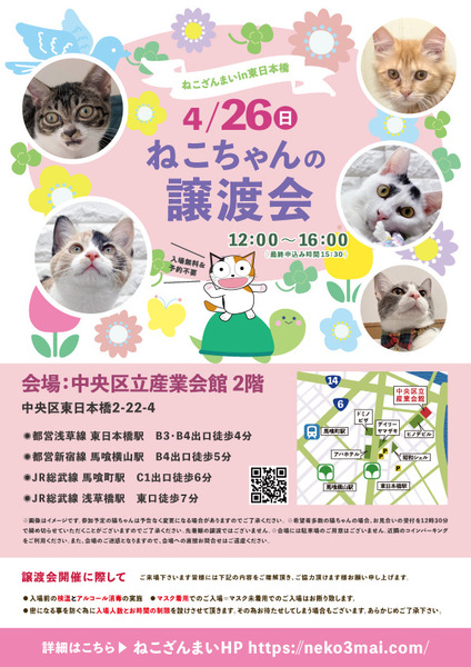 | イベント内容 | ~保護ねこちゃんを家族に迎えませんか?~ 「猫も!里親さんも!保護主も!みんなが笑顔になれる」そんな譲渡会になると良いな♪ 猫ちゃんと里親の赤い糸のご縁結び、どうぞねこざんまいにお手伝いさせて下さい♪ 新しい家族と猫たちの生活が楽しく素敵な毎日でありますように。 そんな生活が送れるよう保護主のサポートも万全です! 11:30より、2階会場入口にて受付を開始します。 受付時に入場予定時間が記入された整理券をお配り致しますので、整理券を受け取った方はお時間になりましたら2階会場入口に番号順にお並び下さい。 ※11:30より早くいらしても、お待ちいただく場所がございません。 また、近隣にお住まいの方や他階フロアのご利用者様にご迷惑となる場合がございますので、受付開始時間にあわせてお越しくださいますよう、何卒ご協力お願い致します。 また、ねこざんまい譲渡会は先着順で里親様を決定する譲渡会ではありません。 先に申込みをした方を優先することもありません。 お話をして、その猫ちゃんに合ったおうちに決めさせていただいております。 12時に開場し、里親様の決定は14時以降となります。 14時以降にご入場の場合、希望の猫ちゃんが決定している可能性があります。 また1頭に対し多数の申込みをいただいた場合、早めに申込みを締め切らせていただく場合がございますので、予めご了承下さい。 開催日2026年4月26日(日)12:00~16:00(最終申込み15:30) 『 東日本橋会場 』 ☆☆☆予約不要・入場無料☆☆☆ 会場 中央区立産業会館2階 中央区東日本橋2-22-4 ※会場へのお問合せはご遠慮ください。 交通 都営浅草線 東日本橋駅 B3又はB4出口 徒歩4分 都営新宿線 馬喰横山駅 B4出口 徒歩5分 JR総武線 馬喰町駅 C1出口 徒歩6分 JR総武線 浅草橋駅 東口 徒歩7分 ※駐車場のご用意はございません。 近隣のコインパーキングをご利用ください。 ホームページ参加猫一覧はこちらから http://www.neko3mai.com/entrycats/entrycats.html ☆子猫希望の里親様☆ 子猫は下痢等により数時間対応ができなかっただけでも死に至る場合があります。 その為、ねこざんまいでは月齢によりお留守番時間の長さを制限させていただきます。 また、子猫ちゃん(6ヶ月未満)の里親様には子猫支援金のご協力をお願い致しております。 ☆ねこざんまいの譲渡会にご来場の里親様☆ 先着順ではございませんので、どうぞ譲渡会開始時間にご来場下さい。 ・譲渡会の流れはこちらから http://www.neko3mai.com/flow/flow.html ・譲渡の際にはいくつかのお約束事がございます。 http://www.neko3mai.com/condition/condition.html ・家族に迎える猫ちゃんが決まった場合、後日里親様のご自宅までお届けいたします。 当日に猫ちゃんをお渡しすることはできませんのでご了承ください。 ☆里親希望のみなさまへ☆ ご家族の皆様で生涯、家族の一員としてたっぷり愛情を注いでくださることを希望しています。 恐れ入りますが ●学生の方、子猫・幼猫希望の60才以上の方のみのご家庭 ●脱走防止対策にご協力いただけない方 は原則譲渡を遠慮させていただいております。 ●一人暮らし・同棲(事実婚)の方 保護主の希望や猫の年齢・性格等により、ご希望に添えない場合もございます。 ☆ご負担頂く費用☆ 譲渡の際に、医療費の一部、お届け時の交通費を里親様にご負担頂いております。 皆様のご協力により、より多くの猫達を救うことができております。 里親様の温かいお気持ちにボランティア一同、心より感謝いたしております。 ご負担頂く医療費につきましてはホームページに詳しく記載させて頂いております。 http://www.neko3mai.com/flow/flow.html ☆よくある質問☆ ・譲渡の条件 ・ご負担頂く費用 ・譲渡会の場所等は ホームページに詳しく掲載させて頂いておりますのでご覧ください。 https://neko3mai.com/ メールでのお問い合わせはすぐにご返答出来ない場合がございますのでご了承ください。 ホームページ https://neko3mai.com/ お問い合わせ http://www.neko3mai.com/contact/form_general.html ねこざんまいブログ http://ameblo.jp/neko3mai/ |