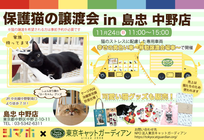 | イベント内容 | 幸せの黄色い車~移動譲渡会場車~in島忠 中野店 幸せの黄色い車~移動譲渡会場車~が、島忠中野店さんにやってきます! 猫のメンタルに配慮した、特別仕様の車です。 ケージ内は冷暖房完備・防音仕様の「幸せの黄色い車」の詳細についてはコチラ! https://tokyocatguardian.org/yellow_car/ 開催日は、twitterでも黄色い車で寛ぐ猫たちの写真を公開★ 猫たちに会いに来ていただけること 猫グッズ購入で支援してくださること 幸せの黄色い車を見に来ていただけること 全てがご支援になります。 お友達と、お誘い合わせの上ぜひよろしくお願いいたします! 会場では、可愛い猫グッズも販売します! しょんぼり顔のふわふわ猫、ふーちゃんのオリジナルグッズも限定発売★ 「子猫の家族になりたい」「可愛い猫グッズが欲しい」「遊びに行くことで支援したい」 という方は是非いらしてください! ★猫の里親になるには事前申し込みが必要です★ 申し込みはコチラ https://tokyocatguardian.org/cats_event/ 「幸せの黄色い車」の詳細についてはコチラ https://tokyocatguardian.org/yellow_car/ 【会場案内】 島忠 中野店 様 〒164-0001 中野区中野2-10-11 google map:https://goo.gl/maps/i8zBCg2bWFy (アクセス) ・電車 JR中央線中野駅南口より徒歩7分 ・車 大型駐車場完備 料金: 2,000円未満 1時間無料 2,000円以上 2時間無料 ※以後30分ごとに300円 |