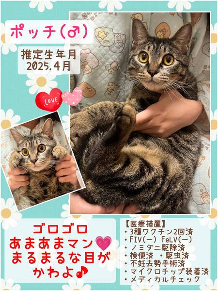 | イベント内容 | 【秘密結社ねこのひげ♡保護猫譲渡会】 4/19(日) 13:00~16:00 埼玉県鶴ヶ島市三ツ木新町1-1-13 カインズ鶴ヶ島店1F カルチャー教室 にて保護猫譲渡会を開催します♪ 昨年秋生まれの仔猫たちや 脳内はまだまだ仔猫やでー! なオトナ猫も元気いっぱい参加します♪ ずっとのご家族さまと 愛し愛されな 両想いになれますように♡ 家族にするなら保護猫だべ♪♪ 新しい家族と笑顔で暮らしたい♪ という方は是非会いにいらしてください♡ ご不明な点がございましたら Instagram @nnnkanto DMにてお問い合わせ下さい☆ |