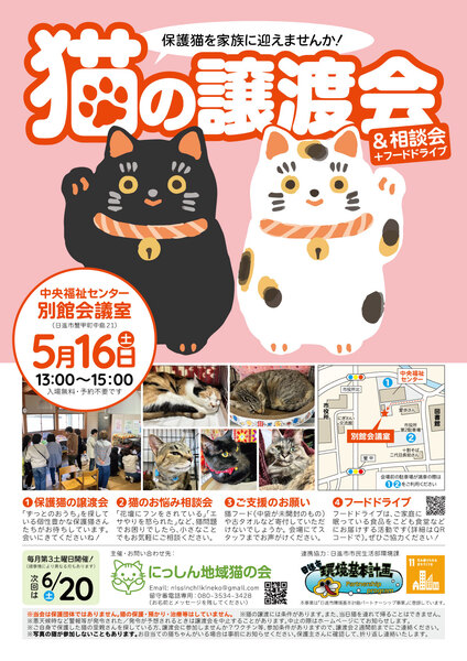 | イベント内容 | 5月16日(土)に「猫の譲渡会&相談会」を開催いたします。 保護猫を迎えたい方はもちろん、猫に関する相談会も同時開催しています。 ご近所との猫トラブルなどでお悩みの方も、どうぞお気軽にお立ち寄りください。 地域貢献の一環として、子ども食堂などに食材を提供するフードドライブの受付もしております。 ご家庭や職場で余っている食品がありましたらぜひお持ちください! 小さな譲渡会ですが、猫さんも人間も良いご縁を紡げられるよう、のんびり続けています。 遊びにきてくださいね(*^^*) 【日時】5月16日(土)13:00〜15:00 【会場】中央福祉センター「別館会議室」 【入場無料・予約不要】 【主催】にっしん地域猫の会 【ホームページ】https://nissinchiikineko.main.jp ※会場は中央福祉センター本館内ではなく、その隣の奥まったところにある小さな建物「別館会議室」にて開催しております。お手数ですが、HPにて地図をご確認ください(中央福祉センターへのお問い合わせはご遠慮ください)。 ※会場前に駐車場がございますが、数が少ないため、満車時は本館の駐車場をご利用ください。図書館のむかいにある市役所の臨時駐車場もご利用いただけます。 ※室内換気のため冷暖房が効きにくい場合がございます。 ※ペット同伴のご入場はできません。 ※猫ちゃんの譲渡には条件がございます。詳細はホームページをご参照ください。 |