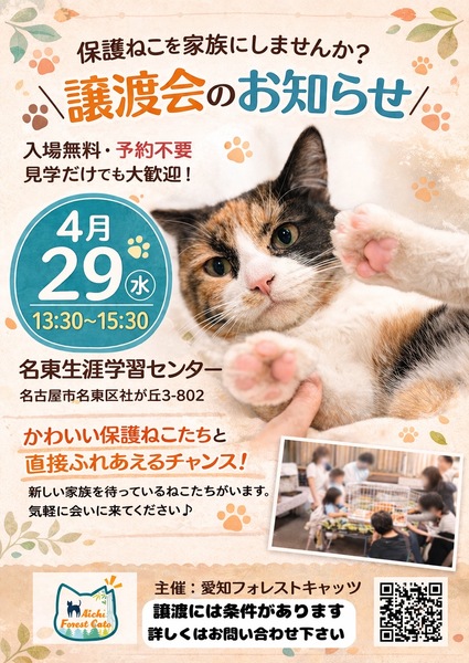 | イベント内容 | 日時 4月29日(祝) 13:30〜15:30 場所 愛知県名東区社が丘3-802 名東生涯学習センター 主催 愛知フォレストキャッツ 地域猫活動やTNR活動の過程などで 保護した猫たち たくさんの猫たちが参加します 見学、相談だけでも大丈夫! 予約不要、参加費無料なのでお気軽に 猫に関する活動を何かしたい、という方も歓迎です 遊びに来る感覚で、お越しくださいませ |