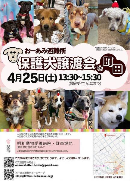 | イベント内容 | ☆★☆★☆★☆★☆★☆★☆★☆★☆★☆★☆★☆★☆ ~4月25日(土)町田にて譲渡会開催!~ ◎場所・・「明和動物愛護病院」 東京都町田市中町1-8-7 小田急線「町田」駅より徒歩約8分 ◎日程・・4月25日(土)(雨天決行) ◎時間・・ 13:30~15:30 (受付15:00まで) *駐車場なのですが満車の場合はこちらでご案内します。 *参加の際は、アルコール消毒のご協力をお願いいたします。 *混雑状況により、入場制限をさせていただく場合がございます。 ※参加予定の犬は体調により参加できない場合があります。ご了承ください。 ☆★☆★☆★☆★☆★☆★☆★☆★☆★☆★☆★☆★☆ |