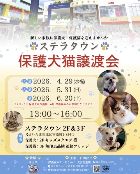 | イベント内容 | *保護犬猫譲渡会* 日時:4/29(水•祝) 13時~16時 場所:ステラタウンさま 飼育崩壊や所有権放棄などで、生きる場所を失った猫たちが、最大限の医療にかけてピカピカになりました。 写真の猫の他にも甘えっこちゃんたちが、溢れる笑顔でお待ちしています。 ぜひご参加ください。 ***譲渡条件*** *完全室内でお願いします *逸走防止対策にご協力頂ける方 *写真付きの身分証をご提示頂ける方 *LINE若しくはメールでのやりとりが可能な方 *譲渡に関する覚え書きにご署名頂ける方 *初期医療費をご負担頂ける方 *その他の譲渡条件を、譲渡会場でお話させて頂ける方 *猫が生まれた年から20年後に、80歳を超えていない方 *お一人暮らしの方は、後見人さまのご同席が必要です *…..*…..*…..*…..*…..*…..*…..*…..*…..*….*…..*…..*…..* しっぽたちの物語 Instagram https://www.instagram.com/sippotatinomonogatari?igsh=MXVkbzh3d3lnNzloOA== *…..*…..*…..*…..*…..*…..*…..*…..*…..*….*…..*…..*…..* |
