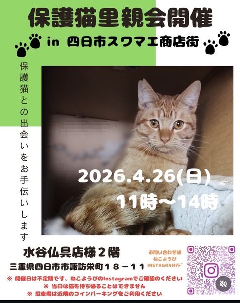 | イベント内容 | 4月26日(日) 11時から14時まで 四日市スワマエ商店街の 水谷仏具店様店舗2階 で猫の里親会を開催します 飛びつきにゃんこの、ゆきも参加です 今回は少なめの4匹参加です 少し寂しい感じにはなりますが まったりのんびりはじめます♪ コーヒーなどを飲みながら 猫のお話しませんか? お待ちしております♪ |