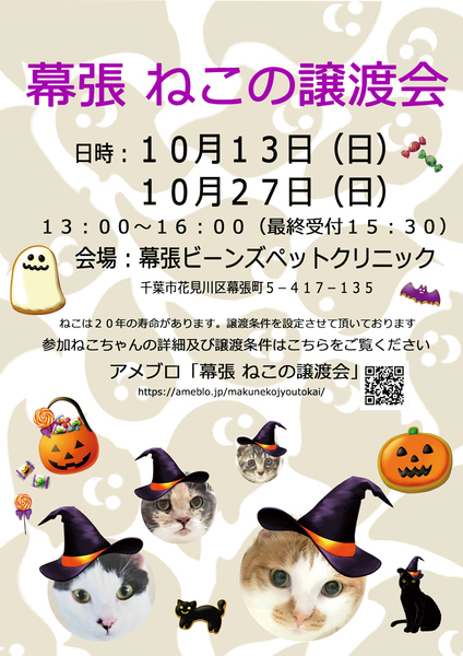 | イベント内容 | 10月27日(日)開催 「幕張 ねこの譲渡会」 千葉市幕張にてねこの譲渡会を開催致します。 譲渡会参加ねこのご確認はコチラ ブログ「幕張 ねこの譲渡会」 http://ameblo.jp/makunekojyoutokai/ 譲渡会直前の掲載もあり得ますので、随時チェックして下さると嬉しいです *開催日 10月27日(日) 13:00より16:00 最終受付15:30 (午前の診察が終わり次第設営です) *会場 幕張ビーンズペットクリニック http://www.m-beans.com/ 〒262−0032 千葉市花見川区幕張町5−417−135 周辺交通機関 JR総武線「幕張」駅より南へ徒歩7分 JR京葉線「海浜幕張」駅より北へ徒歩11分 周辺道路交通網 国道14号(千葉街道)「幕張町5丁目」交差点を南へ直進 国道357号 「若葉」交差点を北へ直進 駐車場は病院駐車場5台あります。詳細はコチラをご覧下さい。 http://www.m-beans.com/parking.html その他 三井のリパーク幕張町5丁目 60分200円 12時間最大600円 譲渡会のお問い合わせは「幕張ビーンズペットクリニック」では無く、こちらにお願い致します makunekojyoutokai★★★@gmail.com (★★★を@に変えてお送り下さい) :::::::::::::::::::::::::::::::::::::::::::::::::::::::::::::::::::::::::::::: 譲渡会は1匹でも多くのねこちゃんが、ひとりでも多くのご希望者様とお見合いをして頂き、 ご縁が繋がることを目的としています。 「開催時間中に1匹でも多くのお見合い」を優先したい為、 混みあった場合は最低限のご説明だけにさせて頂き、 詳細は後日メールやお電話にて対応させて頂く事もございます。 予めご了承下さい。 :::::::::::::::::::::::::::::::::::::::::::::::::::::::::::::::::::::::::::::: 「譲渡の流れ・および譲渡条件」 20年の寿命のあるねこちゃんです。 譲渡条件を設定させて頂いております。 何卒ご了承の程、よろしくお願い 致します。 「譲渡の流れ・および譲渡条件」 20年の寿命があるねこちゃんです。 譲渡条件を設定させて頂いております。 何卒ご了承の程、よろしくお願い致します。 ・譲渡会当日の猫ちゃんのお渡しはしておりません。 ・ねこちゃんとお見合いをして頂き、お話しがまとまりましたら、後日スタッフよりご自宅へのお届けとなります。 ・お届けの際、飼育環境を確認させて頂き、脱走防止対策の確認と身分証明書のご確認、書類の取り交わしなどがございます。 ・譲渡会会場でお聞きしていた事と相違があった場合など、猫ちゃんを連れ帰る場合もございますので、予めご了承下さい。 ・トライアルの有無や期間は保護主さんによって異なります。 ・未成年の方、学生の方、ご高齢の方、単身の方への譲渡は行っておりません。 ・お子様のご予定がある方は万が一アレルギーなどが出てしまった場合のプランをお聞かせください。 * 譲渡条件 * 「終生、愛情を持って家族としてお迎え頂ける方」 「完全室内飼いをお約束頂ける方」 「脱走防止に努めて下さる方」 「万一脱走があった際は、必ず捜索に努めて下さる方」 「1回目の発情前に、必ず不妊・去勢手術を施して下さる方」 「ねこちゃんが具合が悪くなった時には、病院へ連れて行き医療を施して下さる方」 「先住のねこちゃんも同様の飼い方をされている方」 「保護時にかかっている医療費の一部とお届け時の交通費のご負担をお願い出来る方」 「メールでの写真付き定期報告が可能な方(トライアル中は毎日、その後1カ月間は週1、その後5か月間は月1、その後毎年 正式譲渡の日)」(トライアルの有無は保護主さんによって異なります) 「ねこを飼える状態の方」 :::::::::::::::::::::::::::::::::::::::::::::::::::::::::::::::::::::::::::::: Twitter、Facebook、instagramもよろしくお願い致します! ::::::::::::::::::::::::::::::::::::::::::::::::::::::::::::::::::::::::::::: 「保護猫と暮らそう」 新しい小さな家族と出会いに、ぜひご家族皆様でお越しください。 小さな譲渡会ではありますが、スタッフ一同 皆様のご来場を心よりお待ちしております! |