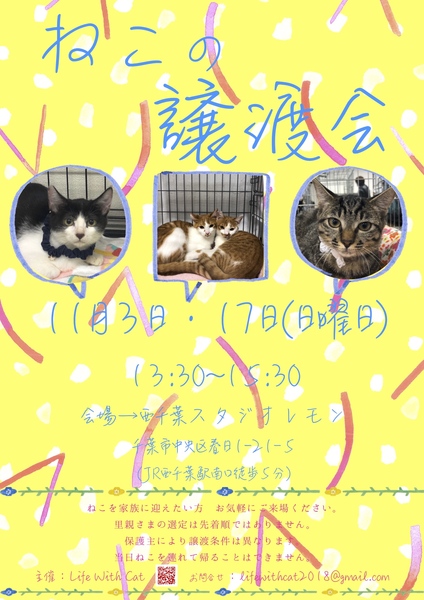 | イベント内容 | 個人ボラさんが愛情をかけて保護している大きな猫ちゃんや小さな猫ちゃんたちが ずっとのお家を求めて集まります。 ねこを家族に迎えたいとお考えの方 どうぞお気軽にご来場ください! *里親さまの選定は先着順ではありません。 *保護主により譲渡条件は異なります。 *当日ねこちゃんを連れて帰ることは出来ません。 後日 保護主が里親様宅へお届けいたします。 *里親様に医療費のご負担をお願いしております。 第23回 Life With Cat『ねこの譲渡会』 11月3日(日曜日) 13:30~15:30 <会場> レンタルスタジオレモン 260-0033 千葉市中央区春日1丁目21-5 (JR西千葉駅/京成西登戸駅より徒歩4分) *駐車場のご用意はございません。 スタジオより徒歩1分圏内にコインパーキングが多数ありますので そちらをご利用ください。 ブログ→https://ameblo.jp/lifewithcat2018/ Facebook→https://www.facebook.com/lifewithcat2018/ メールでのお問い合わせ→lifewithcat2018@gmail.com |