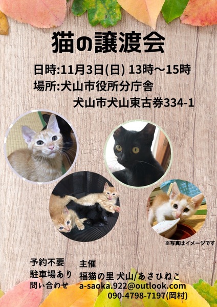 | イベント内容 | 11月3日(日) 場所:犬山市役所分庁舎 2F ところ:犬山市犬山東古券334-1 時間:13:00~15:00 無料駐車場あり 名鉄犬山駅から徒歩3分 予約不要 主催:福猫の里 犬山/あさひねこ お問い合わせ先:a-saoka.922☆outlook.com ☆の部分を@に変えてお問い合わせ下さい?♀️ ------------------------------------------------------ 猫を飼う場合は、室内飼いとしその猫を生涯を通じて責任をもって育てて下さい。 当日猫をお渡しすることはしていません。飼育環境を確認させていただくため、後日ご自宅までお届けします。また、譲渡誓約書を取り交わします。なお、ペット不可物件にお住まいの方への譲渡はお断りしています(。_。*)学生(未成年)の方は保護者の同意があれば譲渡可です?◎✨ 譲渡を希望される方には譲渡会でアンケート記入をお願いしています。アンケートの内容をもとにお話を進めさせていただきます。 猫たちの願いは、生涯大切にしてくれる里親さんに出会うことです? みなさんぜひ一度可愛い猫たちに会いに来てくださいね☪︎ *. お待ちしています♪*゚ |