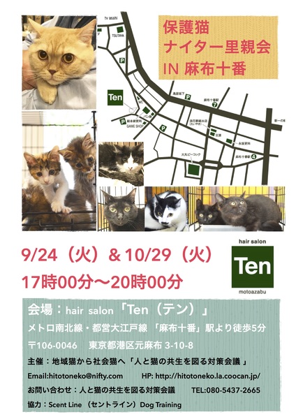 | イベント内容 | FIPフリー:全頭FIP血液検査を実施。陽性の子と陰性の子は隔離、猫たちは最高の環境の中にいます。 コロナウィルス抗体価100未満陰性の子のみ里親会に参加。 また、お問い合せの前にお願い事項の確認をお願いします。 http://homepage2.nifty.com/hitotoneko/keiyaku.html 4箇月齢以下の子猫は、 2頭一組または同世代の先住子猫がいる方、 お留守番時間が8時間以下の方 に限ってお譲りします。 成猫については、お留守番時間についての制限は特にございません。 猫又は犬を4頭以上飼っている方にはお譲りできません。 55歳以上の方には、子猫はお譲り出来ません。 60歳の方は5歳、65歳の方なら10歳の成猫ならお譲りできます。 お試し期間は1週間です。 お申し込み時に、運転免許証、健康保険証など、 身分を保証する証明証の提示をお願いします。 猫が欲しい。猫を飼ってみたい。 猫に不妊・去勢手術を受けさせたい。 猫のボランティアをやってみたい その他、猫の相談よろず引き受けます。 一緒にボランティアをやってみませんか。会員募集中! 港区、新宿区のシェルターの猫のお世話係 週1回、2時間程度、時間帯は自由 学生には交通費として1000円を一律に支給します。 他に、TNRボランティア、搬送ボランティアなどを募集しています。 まずはお気軽に体験作業にお越し下さい。 主催 地域猫から社会猫へ・猫の生きる権利確認連絡協議会 電話 080-5437-2665 メールアドレス hitotoneko@ezweb.ne.jp ホームページ http://hitotoneko.la.coocan.jp |