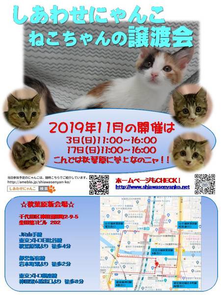 | イベント内容 | しあわせにゃんこは行き場のない猫ちゃんと里親様との出会いの場を提供するグループです♪ 子猫も成猫もハンデのある猫もみんな新しい家族を待っています♪ みなさまのご来場を保護主、スタッフ一同心よりお待ちしております♪ ◆開催日/開催時間◆ 2019年11月17日(日) 11:00~16:00 ご希望の猫ちゃんがいらっしゃる場合は11時30分までに受付をお願い致します。 複数のお申し込みがある場合は11時30分で受付を終了させて頂く場合がございます。 受付をされた全ての里親様とお見合いをさせて頂きます。 ※先着順ではございません ※当日、猫ちゃんを連れて帰ることは出来ません。後日、保護主が里親様宅へお届けいたします。 ◆会場◆ 東京都千代田区神田須田町2-9-5 柴田第1ビル 2階 202号室 ※詳しいアクセスはHPをご覧下さい http://www.shiawasenyanko.net/jyoutokai.html ◆交通手段◆ JR山手線/秋葉原駅 徒歩5分 JR山手線・中央線/神田駅 徒歩8分 東京メトロ日比谷線/秋葉原駅 徒歩4分 東京メトロ銀座線/神田駅 徒歩5分 都営新宿線/岩本町駅 徒歩2分 ※お車でご来場の際、駐車場のご用意はございません。 近隣のコインパーキング等をご利用ください。 いつ里の掲載参加猫一覧はこちらから https://satoya-boshu.net/mypage/foster_list.php?@ps@=none アメーバブログの里親募集にゃんこはこちら https://ameblo.jp/shiawasenyan-ko/theme-10092719565.html ◆猫ちゃんとのお見合い◆ 掲載している猫ちゃんは基本的に譲渡会場でのお見合いのみとなります。 譲渡会への参加が決定している猫ちゃんはその譲渡会で里親様が決定しなかった場合のみ保護主宅でのお見合いが可能となります。 自宅お見合いを希望される里親様はメール(info@shiawasenyanko.net)にてご相談ください。 ◆当譲渡会では猫ちゃんと里親様のスキンシップを大切にしています◆ 新しい家族として20年以上いっしょに暮らしていく猫ちゃんです。 譲渡会場でたくさんの猫ちゃんと触れ合って良きパートナーを見つけてください。 はじめて猫ちゃんを迎える不安や先住猫ちゃんとのトライアルの注意点、猫ちゃんと里親様の暮らし方など気軽にご相談ください。 経験豊富な保護主や猫大好きスタッフがアドバイスさせていただきます。 ◆子猫ご希望の里親様◆ 子猫は急な下痢や発熱等により体調が急変し、数時間対応ができなかっただけでも命を落とす事があります。 その為、当譲渡会では月齢によりお留守番のない又は少ないご家庭への譲渡に限らせて頂いております。 また里親様と子猫ちゃんが安心してトライアル期間を過ごせるよう体重が1㎏程になってからのお届けとさせて頂いております。 ◆里親希望のみなさまへ◆ ご家族の皆様で生涯、家族の一員としてたっぷり愛情を注いでくださるご家庭をお待ちしております。 恐れ入りますが ・独身、単身者の方 ・友人同士、同棲でのお住まいの方 ・高齢者のみのご家庭の方 ・脱走防止対策にご協力頂けない方 はご希望に添えない場合もございますのでご了承下さい。 ※詳しくはその他連絡事項をお読みください。 ◆ご負担頂く費用について◆ 譲渡の際に譲渡負担金(医療費の一部、譲渡金、お届け時の交通費)を里親様にご負担頂く事により 過酷な状況にいる猫ちゃんを保護し新しいご家族の元へ送り出す事ができています。 皆様のご理解とご協力にボランティア一同、心より感謝しております。 ご負担頂く医療費につきましてはホームページに詳しく記載させて頂いております。 http://www.shiawasenyanko.net/onegai.html しあわせにゃんこホームページ http://www.shiawasenyanko.net メールでのお問い合わせ info@shiawasenyanko.net |