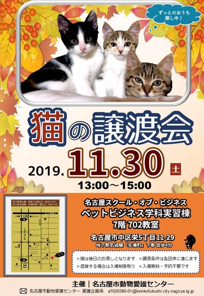 | イベント内容 | 譲渡会のご案内 【主催】 名古屋市動物愛護センター https://www.facebook.com/nagoya.doubutuaigocenter 【日時】 2019年11月30日(土) 13:00~15:00 【場所】 名古屋スクール・オブ・ビジネス ペットビジネス学科実習棟 7階 702教室 名古屋市中区栄5丁目11-29 地下鉄名城線「矢場町」下車 徒歩5分 https://goo.gl/maps/gq2JT5j5AdN2 当センターに登録した譲渡ボランティアの保護している猫たちが多数参加します。 どのねこ達も、新しい家族を探し中! 譲渡ボランティア活動に興味がある方もぜひお立ち寄りください。 ★ご来場者様へ★ ※入場無料、予約不要です ※トライアルや譲渡の条件は各譲渡ボランティア団体に準じます ※猫は後日ご自宅までお届けに参ります ※混雑する場合、入場制限をさせていただくことがございます ★参加する猫たちについて★ ・ノミダニ駆除済 ・ワクチン接種済 ・避妊去勢手術済(6ヶ月未満の子猫除く) ・ウィルス検査済(6ヶ月未満の子猫除く) 猫たちが素敵な出会いを待っています。 譲渡会に関するお問い合わせは 名古屋市動物愛護センター 愛護企画係 a7620380-01@kenkofukushi.city.nagoya.lg.jp までお願いします。 |