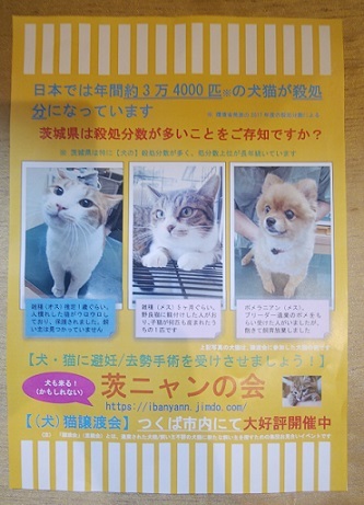 | イベント内容 | 保護ねこ里親会を開催いたします。 ペットフード、ペットシート、猫砂、古タオル、未使用ハガキや切手等のご寄付も会場にてうけたまわります。シーツや毛布類も大歓迎!! シミ等ありましても、洗ってあれば全然OKです! どうぞよろしくお願いします。 東京や千葉方面も猫お届け可能! 沢山の皆様のご来場をお待ちしています! ブログも見て下さい! http://ibanyannokai.livedoor.blog/ ibanyannokai@gmail.com 080(8813)4369 茨ニャンの会 |