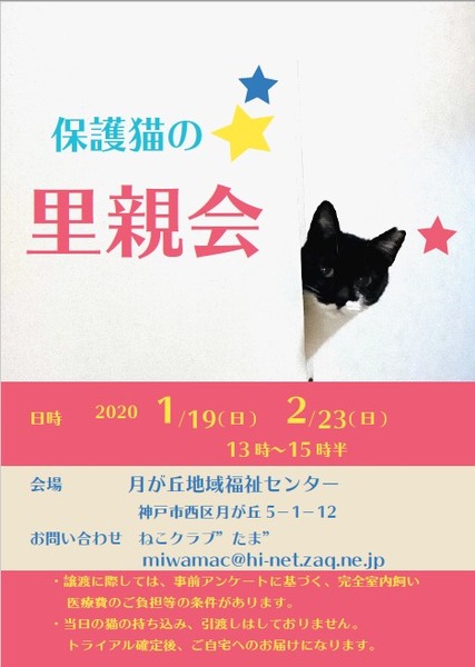 | イベント内容 | ***猫の譲渡会*** 1月19日(日)13時~15時30分 場所 月が丘地域福祉センター(駐車場あります) 〒651-2217神戸市西区月が丘5丁目1-12 神戸電鉄 栄駅 徒歩10分 新年を迎え最初の里親会を開催します まだ子猫のように無邪気に遊びますが、元気に成長してきた中猫さん達も参加します。 お留守番ができますし健康状態も安定していますから、ねこの飼育が初めての方やお仕事をされている方には最適です。 猫さんと別室でふれあえたりできますし、保護主さんから普段の様子や性格などを聞けます。 無料の駐車所も直ぐ近くですので、車でお越し下さっても大丈夫です。 ボランティアが手術・検査・ワクチンをすませて保護しています。 多頭のため充分に愛情がもらえず、人が恋しい猫さんが多いです。 沢山の愛情をかけて下さる里親さんとの出会いを願っています。 |