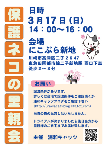 | イベント内容 | 3月17日(日)川崎市高津区二子(二子新地駅より2〜3分)にて「保護ネコの里親会」が開催されます。 日時 3/17(日)14:00〜16:00 会場 にこぷら新地(川崎市高津区二子2-6-47) アクセス 東急田園都市線二子新地駅 西口下車徒歩2〜3分 主催 浦和キャッツ 西口からプロムナード沿いに歩いて2〜3分。 会場は室内なので雨天でも開催します。 子猫〜成猫まで沢山の可愛い猫達が参加予定です。 ぜひ足をお運び下さい。 譲渡にはお願いごとがございます。譲渡条件をご確認下さい。 浦和キャッツ「http://urawacats.blog133.fc2.com/」をご覧下さい。 参加予定猫につきましては 浦和キャッツ http://urawacats.blog133.fc2.com/ または 翔べ!しっぽの猫たち http://shippocats-ganba2016 をご覧下さい。 お家を探している猫が沢山います。 なんとか保護出来た子はみんな幸せへと送り出したいと強く思い活動しています。 猫と暮らしたいと思われましたらぜひ保護猫を家族に迎えて頂けます様に。 |