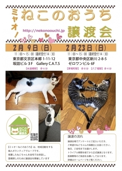 | イベント内容 | 参加する保護猫ちゃんについては、譲渡会一週間前からホームページhttp://nekonoouchi.jp/にてご紹介しております。 事前予約はできません。譲渡会場でお会いしましょう。 ※お問い合わせはホームページ内の【お問い合わせ】からお願い致します。保護主は日々、猫ちゃんのお世話と仕事に忙しくしておりますので、お返事に数日頂くこともございます。ご了承ください。 譲渡会場では、入口で簡単なアンケートにお答えいただきます。 気になる猫ちゃんがいたらスタッフにお声がけください。 面談後、双方に不安がないようでしたら、トライアル開始日をご相談させていただきます。 譲渡会当日に猫ちゃんを連れて帰ることはできません。 トライアル開始日にご自宅にお届けします。 トライアル期間を経て問題がないようでしたら、譲渡成立となります。 詳細は、ホームページ【譲渡の流れ】ページでご確認いただけます。 ◇譲渡に関するお願い 【ミャオ!ねこのおうち譲渡会】では、以下のお約束をお願いしております。 ・完全室内飼いで終生愛育 ・脱走させないための対策 ・不妊去勢手術 ・譲渡誓約書の取り交わし ・医療費の一部ご負担 ・記念の写真撮影 ・原則として、譲渡時に60歳未満の方 その他、ひとり住まいで緊急時の対応に困難な方や、経済的に困難な世帯、必要な脱走対策を施していただけない場合はご遠慮頂いております。 また、保護主により譲渡条件が異なる場合もございますので、会場で十分にご相談ください。 譲渡までの流れ、譲渡時のお願い、医療費の一部ご負担などは、ホームページでご確認いただけます。 nekonoouchi.jp/ |