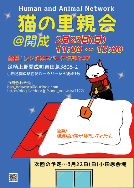 | イベント内容 | 【開催日】2020年3月23日(日) 【時間】11:00~15:00 【会場】レンタルスペース YOU YOU 258-0021 神奈川県足柄上郡開成町吉田島3808−2 【交通案内】 小田急線:開成駅 開成駅 西側ロータリーより徒歩3分 【交通案内】 新宿方面から 小田急線開成駅 横浜方面から JR東海道線:小田原駅 → 小田急線:開成駅 東名高速道路大井松田インターより10分 ・駐車場も近隣にあるので 自家用車でも便利な場所です。 ・屋内開催なの雨天でも開催します。 ※自家用車でお越しの方は近隣の有料パーキングをご利用ください。 *:--☆--:*:--☆--:*:--☆--:*:--☆--:*:--☆--:*:--☆--:* 保護猫さん達の幸せ探し♡里親譲渡会です。 神奈川県西湘地域で保護された猫さん達が参加します。 新しい家族として保護猫さんを迎えませんか? 皆様のご来場をお待ちしております。 *:--☆--:*:--☆--:*:--☆--:*:--☆--:*:--☆--:*:--☆--:* 詳細はブログにて http://blog.livedoor.jp/song_odawara1122/ エントリー猫の情報も随時更新いたします^^ *:--☆--:*:--☆--:*:--☆--:*:--☆--:*:--☆--:*:--☆--:* 里親さんになるための条件は以下のとおりです。 1.終生愛情をもって飼育すること 2.完全室内飼い必須 3.ペット飼育可物件であること 4.脱走防止&名札の装着を徹底できること 5.猫を迎える事に家族全員の同意があること 6.譲渡後の定期報告ができること 7.ご家族に猫アレルギーの方がいないこと 8.単身者と高齢者のご応募は保証人(非常時に飼育対応をしてくれる人)が居ること 9.ワクチン接種と傷病時の適切な治療ができること 10.万が一 猫が脱走した場合は適切な対応ができること 11.医療費と譲渡時の交通費を負担して頂けること 12.ペットを飼育できる十分な収入と時間があること 13.身分証明を提示できること 14.自宅への訪問が可能であること 15.譲渡誓約書の内容を十分理解し、譲渡後も誓約内容を継続的に守って頂けること 16.譲渡が決定した場合、譲受者一部負担金にご協力頂けること |