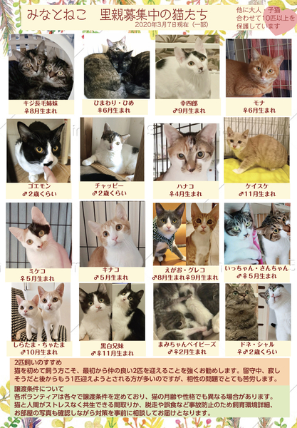 | イベント内容 | 東京都港区で猫の保護や譲渡をしている主婦のメンバーが中心のボランティアグループです。 預かり宅でのお見合いとお台場ヴィーナスフォートで定期的に譲渡会を開催して毎月20匹くらいを譲渡しています。 子猫中心ですが廃業ブリーダーから引き取った大人猫や協力ボランティアさんがセンターから引き出した猫なども参加します。 小規模ですが猫と里親さんの幸せを優先に、飼育環境や猫の経験やご家族構成、お留守時間などをお聞きしてぴったりの猫をご案内します。 初めてでもしっかりとフォローします。 ■注意事項 -混み合っている場合は少し時間をずらしてお越しください。 -猫と人間の安全のためにケージ越しでの触れ合いのみとなります。 -猫それぞれの性質を鑑みて応募条件がありますので是非事前にペットのおうちをご覧ください。 -お目当ての猫がいる場合にはペットのおうちからお申し込みの上、当日お部屋の写真などお持ちください。 -コロナの感染拡大などによりやむを得ず中止となる場合があります。 |