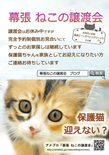 | イベント内容 | コロナウィルス感染拡大防止の為、譲渡会はお休み中ですが、完全予約制の個別お見合いにてずっとのお家探しを継続しています。 お見合い会場は「幕張ビーンズペットクリニック」さんの待合室をお借りし、お昼休みの時間帯の13:30~15:30に行っております。 予め、メールや電話にて、お見合いご希望者様とある程度の所までお話をさせて頂き、会場へお越し頂いておりますが、密を避ける為に、会場へお越し頂く方は、ご家族を代表して出来ればおひとり、またはお二人まで程度でお願いしております。 時間は決まっておりますが、開催日は、お見合いご希望者様と保護主さん双方の都合の良い日で行っております。 成田方面で活動されていらっしゃる保護主さんは、ご自宅をお見合い会場とされていらっしゃいますので、 上記の通りではございません。 ねこちゃんによりお見合い会場が異なりますので、お問い合わせ下さい。 ブログ「幕張 ねこの譲渡会」 http://ameblo.jp/makunekojyoutokai/ *会場 幕張ビーンズペットクリニックさん http://www.m-beans.com/ 〒262−0032 千葉市花見川区幕張町5−417−135 周辺交通機関 JR総武線「幕張」駅より南へ徒歩7分 JR京葉線「海浜幕張」駅より北へ徒歩11分 周辺道路交通網 国道14号(千葉街道)「幕張町5丁目」交差点を南へ直進 国道357号 「若葉」交差点を北へ直進 駐車場は病院駐車場5台あります。詳細はコチラをご覧下さい。 http://www.m-beans.com/parking.html その他 三井のリパーク幕張町5丁目 60分200円 12時間最大600円 譲渡会のお問い合わせは「幕張ビーンズペットクリニック」さんでは無く、こちらにお願い致します makunekojyoutokai★★★@gmail.com (★★★を@に変えてお送り下さい) :::::::::::::::::::::::::::::::::::::::::::::::::::::::::::::::::::::::::::::::::::::::::: 「譲渡の流れ・および譲渡条件」 20年の寿命のあるねこちゃんです。 譲渡条件を設定させて頂いております。 何卒ご了承の程、よろしくお願い致します。 ・当日のねこちゃんのお渡しはしておりません。 ・ねこちゃんとお見合いの後、お話がまとまりましたら後日スタッフよりご自宅へお届けとなります。 ・トライアルの有無や期間は保護主さんにより異なります。 ・お届けの際、飼育環境を確認させて頂き、脱走防止対策の確認と身分証明書のご確認、書類の取り交わしなどがございます。 ・譲渡会会場でお聞きしていた事と相違があった場合など、ねこちゃんを連れて帰る場合もございますので予めご了承下さい。 ・学生さん、未成年の方・単身者の方・ご高齢の方・同棲カップルの方への譲渡は行っておりません。 (同棲歴が長く内縁関係にある方はご相談下さい。) ・お子さんを予定されていらっしゃる方は、お子さんがお生まれの後、お子さんの猫アレルギー検査をされ、問題なしとなってから、ねこちゃんをお迎えになられる事をお勧めしております。 * 譲渡条件 * 「終生、愛情を持って家族としてお迎え頂ける方」 「ご家族の全員がそのねこちゃんの飼育を希望されているお家」 「完全室内飼いをお約束頂ける方」 「脱走防止に努めて下さる方」 「万一脱走があった際は、必ず捜索に努めて下さる方」 「1回目の発情前に、必ず不妊・去勢手術を施して下さる方」 「ねこちゃんが具合が悪くなった時には、病院へ連れて行き医療を施して下さる方」 「先住のねこちゃんも同様の飼い方をされている方」 「保護時にかかっている医療費の一部とお届け時の交通費のご負担をお願い出来る方」 「メールでの写真付き定期報告が可能な方(トライアル中は毎日、その後1カ月間は週1、その後5か月間は月1、その後毎年 正式譲渡の日)」(トライアルの有無は保護主さんによって異なります) 「ねこを飼える状態の方」 |