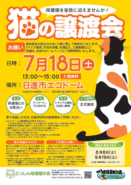 | イベント内容 | 7月18日(土)に「猫の譲渡会」を開催いたします。 猫少なめのミニ譲渡会です。 保護猫を迎えたい方はもちろん、猫トラブルでお悩みの方もお立ち寄りください!(^^)/ 新型コロナウイルス感染症拡大防止のため、入場に際して制約がございますので、ご理解・ご協力をお願いいたします。詳細は、当ページにて随時更新いたします。 【日時】2020年7月18日(土)13:00〜15:00 【会場】日進市エコドーム(中央環境センター) ※入場無料です。 ※ペット同伴のご入場はできませんので、予めご了承ください。 ※猫ちゃんの譲渡には条件がございます。詳細はホームページをご参照ください。 ※車でお越しの方は、日進市役所の駐車場をご利用ください(徒歩1分)。エコドームの駐車場は、ごみを持参される方専用のため、利用できません。ごみの処分を兼ねてお立ち寄りくださる場合でも、誠にお手数ですが、ごみ処分後にお車を日進市役所の駐車場へ移動していただきますよう、どうぞご協力をお願いいたします。 【主催】にっしん地域猫の会 【ホームページ】http://nissinchiikineko.main.jp |