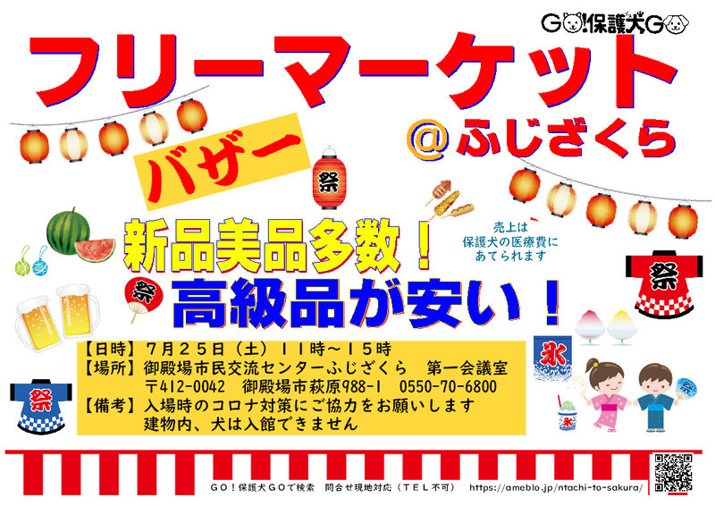 | イベント内容 | GO!保護犬GO 保護犬たちの医療費を稼ぐぞフリマ@ふじざくら 個人ボランティアGO!保護犬GO 犬に直接かかる費用以外は自己負担しております 莫大な費用をかけていますが、犬の幸せのため 全国の応援者様よりいただいたお品を売り 笑顔の渦を起こします コロナの中ですが、自然豊かな御殿場へぜひお越しください ワンちゃんお洋服、リード、首輪などワンコグッズはもちろん セカンドハンド・洋服、バッグ、靴、高級品もお買い得 GO!保護犬GOの保護犬を迎えたい方限定 保護犬相談会 同時開催 主催者HP(ブログ) GO!保護犬GO ~見る・知る・伝える→殺処分ゼロへ~ https://ameblo.jp/ntachi-to-sakura/ |