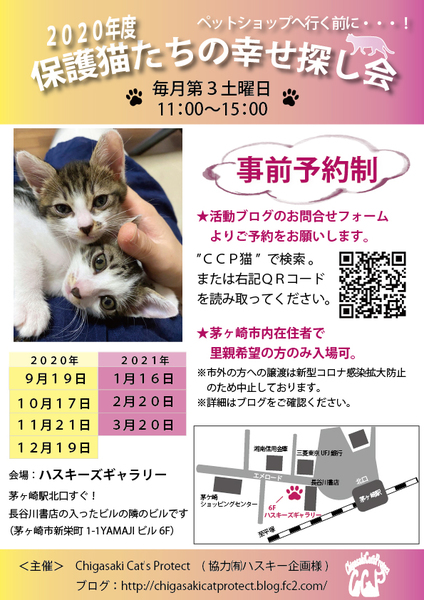 | イベント内容 | 神奈川県茅ケ崎市内のみで活動している猫専門保護団体 Chigasaki Cat's Protect主催の保護猫たちの幸せ探し会(里親会)情報です。 参加猫さん情報等は当会ブログよりご確認ください。 http://chigasakicatprotect.blog.fc2.com/ 【yahooで「Chigasaki Cat's Protect」「CCP猫」で検索可能】 ◆新型コロナウイルス対策のため、事前予約制となっております。ご注意ください◆ 茅ヶ崎市内で保護された猫さんが参加します。 幸せ探し会は毎月第3土曜日に開催しております。 屋内開催なので天気に左右されずに開催中♪ ◆会場:茅ヶ崎駅北口徒歩1分ハスキーズギャラリー 〒253-0044 神奈川県茅ヶ崎市新栄町1-1YAMAJIビル6F 午前11時~午後3時まで(14時半までにご来場ください) 毎月第3土曜日に開催致します。 0歳~2歳までの猫さんたちが 素敵な家族とのご縁を待っております。 ※譲渡条件があります ※当日お引き渡しはありません。後日ご自宅へメンバーがお届けとなります。 ※お見合い希望の猫さんがいるが当日ご都合が悪い場合はお問い合わせください。他の日にお見合い可能です。 CCP活動ブログ http://chigasakicatprotect.blog.fc2.com/ メールでのお問い合わせ chigasakicatprotect@yahoo.co.jp |