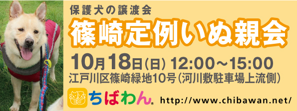 | イベント内容 | 2020年10月18日 第452回 定例いぬ親会(166回)開催のご案内 ちばわんからのお願い いぬ親・ねこ親さんになるまで預かりボランティアについて 新型コロナウィルス感染予防のため イベント会場では必ずマスクを着用していただきますようお願いいたします。 また、受付で検温と消毒をしていただきます。 ご案内 10月の定例いぬ親会開催のご案内です。 8ヵ月ぶりに定例いぬ親会を開催することになりました! 下記をお読みいただき、可愛い保護犬たちに会いに来て下さい。 【ちばわんからのお願い】 ①会場内ではマスクの着用をお願いします。 ②入場の際、検温と消毒をいたします。体温が37.5℃以上の場合、入場をお断りさせていただく場合があります。 ③会場内が密にならないよう入場制限をさせていただく場合があります。 ④卒業犬の同伴は当面の間、できるかぎりご遠慮をお願いいたします。 ※HPでもいぬ親さんを募集しているため、ポスターのいぬが参加犬とは限りません。 開催日 【日時】10月18日(日) 12:00~15:00 ※お天気によっては早めに終了する場合もございます。 場所 江戸川河川敷 篠崎緑地10号そば(河川敷駐車場そば) 東京都江戸川区上篠崎1丁目 アクセス 車:京葉道路の篠崎出口で降りてください。 東京方面から来られる場合は一之江ICをお降りください。 駐車場からみて上流側(川を正面に見て左側)が開催場所になります。 注:舗装道路への駐車は禁止されています。 駐車スペースは、川沿いの土地面のみとなります。 緊急車両が通るための舗装道路になりますので、万が一何かあったときに緊急車両が通れないなどの事態を招く恐れになります。 必ず、川沿いの駐車場をご利用下さい。 電車:都営新宿線 篠崎駅 徒歩約15分 電車&京成バス利用の場合: ①都営新宿線「篠崎駅」下車 「小72 小岩駅行き」バス乗車5分、5個目の「上篠崎」下車後徒歩2分 ②JR総武線「小岩駅」下車 「小72 瑞江駅 ・一之江駅行き」バス乗車10分、8個目の「上篠崎」下車後徒歩2分 注意事項 確認をせずにわんちゃんに触る方が増えております。いきなり知らない人に触られたらわんちゃんも驚きます。 事故などが起きないよう、必ず近くにいるちばわんボランティアに確認をとってから触るようにして下さい。 愛犬をお連れの方へ 会場内はノー・リード禁止です。会場内では必ずリードを短め持ち、首輪やハーネスのゆるみなどがないようご確認ください。フレキシブル(伸縮)リードは禁止させていただきます。 また、会場によっては犬の同伴を禁止していることがありますので、各会場の注意事項をご確認ください。 お子様連れの方へ 会場内での遊具遊びはお断りしています。走り回ったり、大声を出すと犬猫たちが怖がってしまうことがあります。会場内ではお子様となるべく手をつなぎ、1人で歩き回ることのないよう注意しましょう。 また、お子様だけでのご来場はお断りさせていただいております。事故防止のためにご理解ください。 会場内は飲食・酒・歩きタバコは禁止です! 会場内へのアルコールの持ち込みはご遠慮ください。 喫煙は会場の外でお願いします。 また、ゴミは必ずお持ち帰りください。 ※強い雨の場合は中止いたします。微妙なお天気 または 中止の場合は、こちらでお知らせします。 いぬ親会当日、個別でのメールでのご連絡はできません。 【いぬ親会での流れ】 ①いぬ親会は屋外で開催しておりますので、いぬ親募集中のわんちゃんとお会いになりたい方はどなたでも自由にご参加いただくことができます。当日は、受付でいぬ親会案内カードを受け取り会場に入って下さい。ちばわんボランティアは首から名札をさげていますので、どうぞご遠慮なくお声をかけて下さい。また、いぬ親募集中のわんちゃんのそばには預かりボランティアが控えておりますのでわんちゃんについてのご質問も受け付けております。 ②気に入ったわんちゃんがいましたら、お申し込みアンケートにご記入の上、ボランティアにお渡し下さい。(前日までにアンケートを送信してお申し込みいただくこともできます。) 【いぬ親】お申込みアンケート ③アンケート内容を拝見し、お話させていただきます。 ④原則として3日以内にお返事の連絡をさせていただきます。 ⑤ご縁が成立した場合には、後日、こちらからご自宅までわんちゃんをお届けし、約1ヶ月のお試し生活に入っていただきます。 お届けの際に、書面での譲渡契約書を交わします。 ※ワクチン・不妊手術代など保護犬にかかった費用は、家族になるいぬ親さんにもご負担をお願いしています |