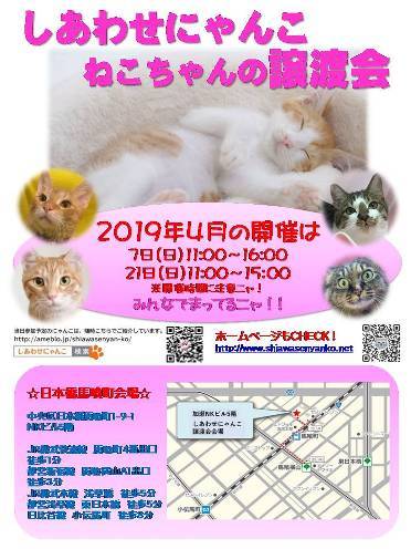 | イベント内容 | しあわせにゃんこは行き場のない猫ちゃんと里親様との出会いの場を提供するグループです♪ 子猫も成猫もハンデのある猫もみんな新しい家族を待っています♪ みなさまのご来場を保護主、スタッフ一同心よりお待ちしております♪ ◆開催日/開催時間◆ 2019年4月7日(日) 11:00~16:00 ご希望の猫ちゃんがいらっしゃる場合は11時30分までに受付をお願い致します。 複数のお申し込みがある場合は11時30分で受付を終了させて頂く場合がございます。 受付をされた全ての里親様とお見合いをさせて頂きます。 ※先着順ではございません ※当日、猫ちゃんを連れて帰ることは出来ません。後日、保護主が里親様宅へお届けいたします。 ◆会場◆ 東京都中央日本橋馬喰町1-9-1 加瀬ビル162 5階(エレベーターをご利用下さい) ※詳しいアクセスはHPをご覧下さい http://www.shiawasenyanko.net/jyoutokai.html ◆交通手段◆ JR総武快速線 馬喰町駅 徒歩1分 4番出口徒歩1分 JR総武本線 浅草橋駅 徒歩5分 都営浅草線 東日本橋駅 徒歩5分 都営新宿線 馬喰横山駅 A1出口徒歩3分 東京メトロ日比谷線 小伝馬町 徒歩8分 ※お車でご来場の際、駐車場のご用意はございません。 近隣のコインパーキング等をご利用ください。 いつ里の掲載参加猫一覧はこちらから https://www.satoya-boshu.net/keiji/viewtopic.php?f=3&t=4288 アメーバブログの里親募集にゃんこはこちら https://ameblo.jp/shiawasenyan-ko ◆猫ちゃんとのお見合い◆ 掲載している猫ちゃんは基本的に譲渡会場でのお見合いのみとなります。 譲渡会への参加が決定している猫ちゃんはその譲渡会で里親様が決定しなかった場合のみ保護主宅でのお見合いが可能となります。 自宅お見合いを希望される里親様はメール(info@shiawasenyanko.net)にてご相談ください。 ◆当譲渡会では猫ちゃんと里親様のスキンシップを大切にしています◆ 新しい家族として20年以上いっしょに暮らしていく猫ちゃんです。 譲渡会場でたくさんの猫ちゃんと触れ合って良きパートナーを見つけてください。 はじめて猫ちゃんを迎える不安や先住猫ちゃんとのトライアルの注意点、猫ちゃんと里親様の暮らし方など気軽にご相談ください。 経験豊富な保護主や猫大好きスタッフがアドバイスさせていただきます。 ◆子猫ご希望の里親様◆ 子猫は急な下痢や発熱等により体調が急変し、数時間対応ができなかっただけでも命を落とす事があります。 その為、当譲渡会では月齢によりお留守番のない又は少ないご家庭への譲渡に限らせて頂いております。 また里親様と子猫ちゃんが安心してトライアル期間を過ごせるよう体重が1㎏程になってからのお届けとさせて頂いております。 ◆里親希望のみなさまへ◆ ご家族の皆様で生涯、家族の一員としてたっぷり愛情を注いでくださるご家庭をお待ちしております。 恐れ入りますが ・独身、単身者の方 ・友人同士、同棲でのお住まいの方 ・高齢者のみのご家庭の方 ・脱走防止対策にご協力頂けない方 はご希望に添えない場合もございますのでご了承下さい。 ※詳しくはその他連絡事項をお読みください。 ◆ご負担頂く費用について◆ 譲渡の際に譲渡負担金(医療費の一部、譲渡金、お届け時の交通費)を里親様にご負担頂く事により 過酷な状況にいる猫ちゃんを保護し新しいご家族の元へ送り出す事ができています。 皆様のご理解とご協力にボランティア一同、心より感謝しております。 ご負担頂く医療費につきましてはホームページに詳しく記載させて頂いております。 http://www.shiawasenyanko.net/onegai.html しあわせにゃんこホームページ http://www.shiawasenyanko.net メールでのお問い合わせ info@shiawasenyanko.net |
