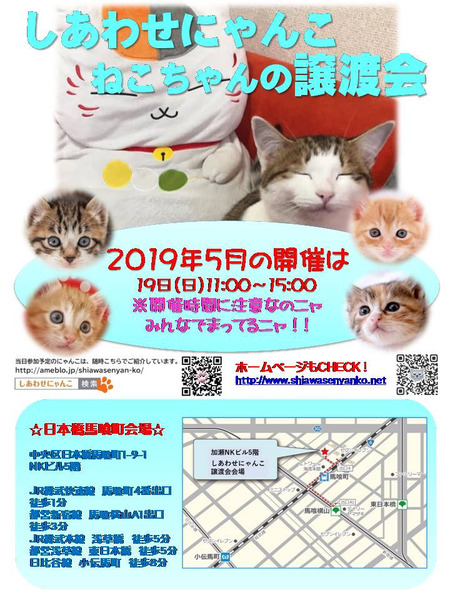 | イベント内容 | しあわせにゃんこは行き場のない猫ちゃんと里親様との出会いの場を提供するグループです♪ 子猫も成猫もハンデのある猫もみんな新しい家族を待っています♪ みなさまのご来場を保護主、スタッフ一同心よりお待ちしております♪ ◆開催日/開催時間◆ 2019年5月19日(日) 11:00~15:00 ご希望の猫ちゃんがいらっしゃる場合は11時30分までに受付をお願い致します。 複数のお申し込みがある場合は11時30分で受付を終了させて頂く場合がございます。 受付をされた全ての里親様とお見合いをさせて頂きます。 ※先着順ではございません ※当日、猫ちゃんを連れて帰ることは出来ません。後日、保護主が里親様宅へお届けいたします。 ◆会場◆ 東京都中央日本橋馬喰町1-9-1 加瀬ビル162 5階(エレベーターをご利用下さい) ※詳しいアクセスはHPをご覧下さい http://www.shiawasenyanko.net/jyoutokai.html ◆交通手段◆ JR総武快速線 馬喰町駅 徒歩1分 4番出口徒歩1分 JR総武本線 浅草橋駅 徒歩5分 都営浅草線 東日本橋駅 徒歩5分 都営新宿線 馬喰横山駅 A1出口徒歩3分 東京メトロ日比谷線 小伝馬町 徒歩8分 ※お車でご来場の際、駐車場のご用意はございません。 近隣のコインパーキング等をご利用ください。 いつ里の掲載参加猫一覧はこちらから https://www.satoya-boshu.net/keiji/viewtopic.php?f=3&t=4288 アメーバブログの里親募集にゃんこはこちら https://ameblo.jp/shiawasenyan-ko ◆猫ちゃんとのお見合い◆ 掲載している猫ちゃんは基本的に譲渡会場でのお見合いのみとなります。 譲渡会への参加が決定している猫ちゃんはその譲渡会で里親様が決定しなかった場合のみ保護主宅でのお見合いが可能となります。 自宅お見合いを希望される里親様はメール(info@shiawasenyanko.net)にてご相談ください。 ◆当譲渡会では猫ちゃんと里親様のスキンシップを大切にしています◆ 新しい家族として20年以上いっしょに暮らしていく猫ちゃんです。 譲渡会場でたくさんの猫ちゃんと触れ合って良きパートナーを見つけてください。 はじめて猫ちゃんを迎える不安や先住猫ちゃんとのトライアルの注意点、猫ちゃんと里親様の暮らし方など気軽にご相談ください。 経験豊富な保護主や猫大好きスタッフがアドバイスさせていただきます。 ◆子猫ご希望の里親様◆ 子猫は急な下痢や発熱等により体調が急変し、数時間対応ができなかっただけでも命を落とす事があります。 その為、当譲渡会では月齢によりお留守番のない又は少ないご家庭への譲渡に限らせて頂いております。 また里親様と子猫ちゃんが安心してトライアル期間を過ごせるよう体重が1㎏程になってからのお届けとさせて頂いております。 ◆里親希望のみなさまへ◆ ご家族の皆様で生涯、家族の一員としてたっぷり愛情を注いでくださるご家庭をお待ちしております。 恐れ入りますが ・独身、単身者の方 ・友人同士、同棲でのお住まいの方 ・高齢者のみのご家庭の方 ・脱走防止対策にご協力頂けない方 はご希望に添えない場合もございますのでご了承下さい。 ※詳しくはその他連絡事項をお読みください。 ◆ご負担頂く費用について◆ 譲渡の際に譲渡負担金(医療費の一部、譲渡金、お届け時の交通費)を里親様にご負担頂く事により 過酷な状況にいる猫ちゃんを保護し新しいご家族の元へ送り出す事ができています。 皆様のご理解とご協力にボランティア一同、心より感謝しております。 ご負担頂く医療費につきましてはホームページに詳しく記載させて頂いております。 http://www.shiawasenyanko.net/onegai.html しあわせにゃんこホームページ http://www.shiawasenyanko.net メールでのお問い合わせ info@shiawasenyanko.net |