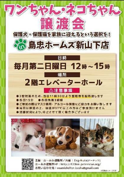 | イベント内容 | ~1月10日(日)新山下にて譲渡会開催!~ ◎場所・・「島忠 新山下店」 神奈川県横浜市中区新山下2丁目12−34 JR根岸線「桜木町駅」より横浜市営バス(8.26.58.148系統)乗車「貯木場前」より徒歩約5分 みなとみらい線「元町・中華街駅」より徒歩約15分 ◎日程・・1月10日(日)(雨天決行) ◎時間・・12時から15時 【14時30分受付終了】 (会場に利用可能な無料駐車場がございます。そちらをご利用くださいませ。) 今回はコロナ対策のため、制限を設けての開催となります。 *3密対策のため、当日11時30分より整理券を配布いたします。 *各回15分 *各回先着3組様 *参加の際は、マスクの着用、アルコール消毒のご協力をお願いいたします。 *当日は検温の上、体温が37度以上の方はご参加いただけません。 *混雑状況により、中止させていただく場合がございます。 ※参加予定の犬猫は体調により参加できない場合があります。ご了承ください。 ☆★☆★☆★☆★☆★☆★☆★☆★☆★☆★☆★☆★☆★☆★☆★☆★☆★☆★☆ |