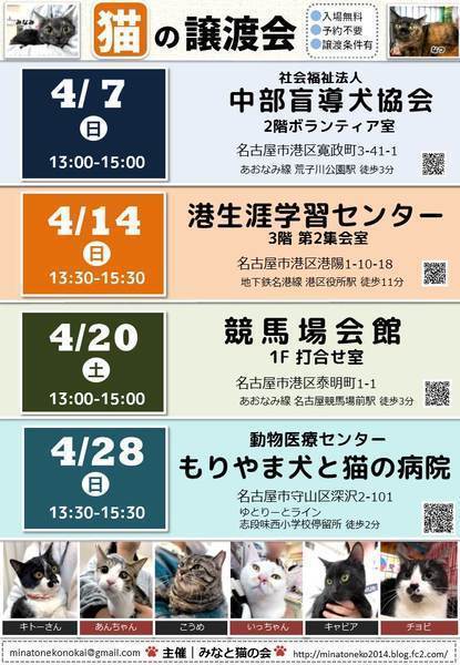 | イベント内容 | =みなと猫の会 第192回譲渡会のお知らせ== 新しい家族を待つ猫たちに 会いに来ませんか? ◆ペットショップへ行く前にぜひ譲渡会へ◆ トイレトレーニングや 基本的な健康診断を終わらせた 生後3ヶ月~7才くらいの 猫たちが大集合! ○主 催 みなと猫の会 ○日 時 4月28日(日)13:30~15:30 ○場 所 動物医療センター もりやま犬と猫の病院 名古屋市守山区深沢2-101 ゆとりーとライン 志段味西小学校バス停留所 徒歩2分 https://goo.gl/maps/oPzQu3PWqE32 ※車でお越しの場合は 病院第2駐車場をご利用ください ※お問い合わせは会場ではなく minatonekonokai@gmail.comまで ○参加猫について ・参加している猫は、ワクチンや駆虫等の基本治療を済ませています。 また、年齢に応じて避妊去勢手術を行っています。 ・参加予定猫が体調不良などで急遽不参加になることもあります。 ○ご来場の皆様へ ・譲渡会の見学は入場無料・予約不要です。 ・当日に猫をお渡しすることはありません。 後日ご自宅までお届けに伺います。 ・一週間から二週間のトライアル期間後、正式譲渡となります。 ・トライアル及び譲渡の際には 完全室内飼い・ご家族の同意・脱走防止策・ アンケート記入など諸条件がございます。 ・里親様には治療費の一部ご負担をお願いしております。 これ以上不幸な猫を増やさないための 治療費とさせて頂きますので何卒ご理解ください。 ・非会員の個人保護者も参加しています。 譲渡条件やトライアルは猫の保護者に準じます。 ・譲渡会の流れ http://minatoneko2014.blog.fc2.com/blog-entry-11.html ○参加猫情報は随時更新中! ↓↓参加猫一覧↓↓ http://minatoneko2014.blog.fc2.com/blog-entry-493.html ○猫に関する相談も受け付けています ねこについての困りごと、トラブルなどを抱えている方、 相談へいらっしゃいませんか。 ○次回以降の譲渡会予定 日時:5月5日(日)13時~ 場所:社会福祉法人 中部盲導犬協会 2階ボランティア室 名古屋市港区寛政町3-41-1 あおなみ線「荒子川公園」駅下車徒歩3分 日時:5月12日(日)13時30分~ 場所:港生涯学習センター 3階 第2集会室 名古屋市港区港陽1丁目10−18 地下鉄名港線「港区役所」駅より徒歩9分 日時:5月18日(土)13時~ 場所:競馬場会館 1F 打合せ室 名古屋市港区泰明町1-1 あおなみ線「名古屋競馬場前」駅下車徒歩3分 ◎主催者ブログ みなと猫の会 ~こぴっと猫だより~ http://minatoneko2014.blog.fc2.com/ ◎参加者のブログ myままさんブログ「にゃんこの宝箱」 http://wagayamama.cocolog-nifty.com/jiru/ 犬白ママさんブログ「犬白日記」 http://k531.blog25.fc2.com/ uzumakinecoさんブログ「猫ときどき雨」 http://uzumakineco.blogspot.jp/ sion1226さんブログ「さとおやさがし」 http://sion1226.blog.fc2.com/blog-entry-1.html ■上記ブログに会ってみたい猫がいた!でも参加予定猫に入ってない、 どうすればいいの? ■譲渡会当日は都合が悪くて… それ以外の日に猫とお見合いがしたい! などのお問い合わせは minatonekonokai@gmail.com まで 写真1枚目 じょん ♂ 11ヶ月 のんびりまったりした温厚なブラックスモーク男子 写真2枚目 椿(つばき) ♀ 2~3才 会場ではツンツン お家ではスリゴロの甘えっこ ☆★個性豊かな猫たちが皆様をお迎えします★☆ 猫とスタッフ一同、お待ちしております。 |