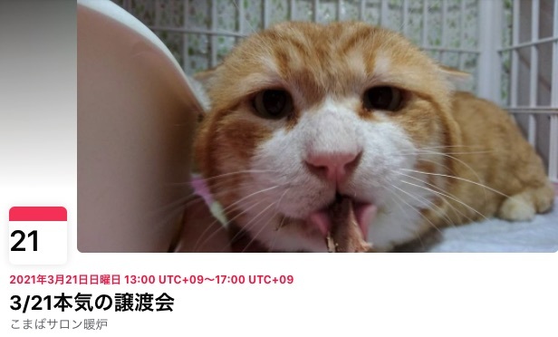 | イベント内容 | 2021/3/21(日) 13:00~17:00 東京都目黒区駒場4-3-65 こまばサロン暖炉 https://fb.me/e/3z3HHmhCl ※必ず主催者様のイベントページをご確認ください。 [主催] 保護猫譲渡会カフェ こまばサロン暖炉 [Facebook] https://www.facebook.com/nyankomaba ※予約優先制となりました。 30分毎入れ替え制 各回5組(10名まで)限定 早くにいらっしゃっても時間前には入れません。 30分で猫ちゃんを選んで、お申し込みの方はお申し込みのお部屋へ移動してください。 お申し込みのない場合はそのままご退出ください。 ご予約は主催者様メールアドレス nyankoma222@gmail.com に、 以下の点を添えてお申し出ください。 ・名前(ニックネーム可) ・希望時間帯 ・人数(なるべく2~3名に抑えて下さい) ・会いたい猫がいれば猫の名前 トラブル防止のため、電話ではなくメールでのご予約をお願いします。 現時点での予約状況はFacebookのイベントページで順次更新されますのでご確認ください。 |