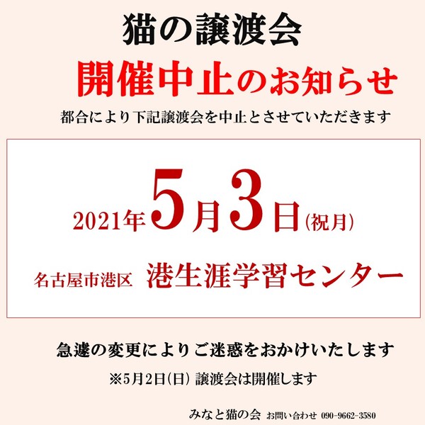 | イベント内容 | 【5月3日譲渡会は開催中止となりました】 急遽の変更でご迷惑をおかけいたします 大変申し訳ございません ○次回以降の譲渡会予定 日時:2021年5月9日(日)13:30-15:30 場所:港生涯学習センター 3階 視聴覚室 名古屋市港区港陽1-10-18 地下鉄名港線「港区役所」駅より徒歩9分 日時:2021年5月16日(日)13:30-15:30 場所:熱田生涯学習センター 第3集会室 名古屋市熱田区熱田西町2-13 地下鉄名城線地下鉄「神宮西」駅より徒歩15分 日時:2021年5月23日(日) 13:30-15:30 場所:動物医療センター もりやま犬と猫の病院 新館2階 会議室 愛知県名古屋市守山区深沢2-101 ゆとりーとライン「志段味西小学校」バス停留所 徒歩2分 日時:2021年5月30日(日)13:30-15:30 場所:熱田生涯学習センター 第3集会室 名古屋市熱田区熱田西町2-13 地下鉄名城線地下鉄「神宮西」駅より徒歩15分 ◎主催者ブログ みなと猫の会 ~こぴっと猫だより~ http://minatoneko2014.blog.fc2.com/ ◎参加者のブログ myままさんブログ「にゃんこの宝箱」 http://wagayamama.cocolog-nifty.com/jiru/ 犬白ママさんブログ「犬白日記」 http://k531.blog25.fc2.com/ uzumakinecoさんブログ「猫ときどき雨」 http://uzumakineco.blogspot.jp/ sion1226さんブログ「さとおやさがし」 http://sion1226.blog.fc2.com/blog-entry-1.html ■上記ブログに会ってみたい猫がいた!でも参加予定猫に入ってない、 どうすればいいの? ■譲渡会当日は都合が悪くて… それ以外の日に猫とお見合いがしたい! などのお問い合わせは minatonekonokai@gmail.com まで 〇感染症の拡大防止にご協力願います ※会場入出時の手の消毒にご協力ください ※定期的に換気作業を行います ※マスク等の装着を推奨しております ☆★個性豊かな猫たちが皆様をお迎えします★☆ 猫とスタッフ一同、お待ちしております |