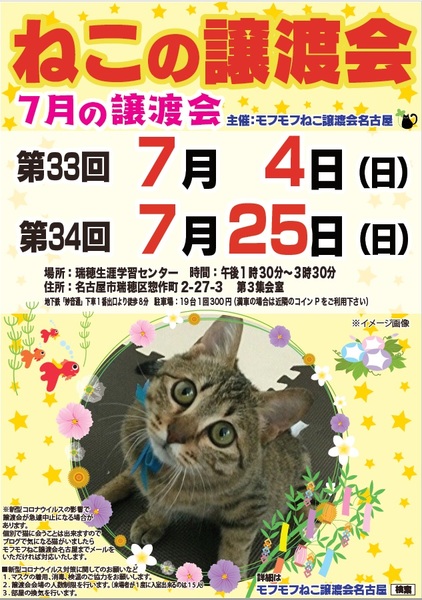 | イベント内容 | モフモフねこ譲渡会名古屋 猫たちの幸せなお家探しのために譲渡会を開催しております。 個人ボランティアの集まりです。 自分たちの出来ることから頑張っております! 一匹でも幸せになれる猫が増えますように 場所 瑞穂生涯学習センター 第3集会室 住所 名古屋市瑞穂区惣作町2-27-3 時間 13時30分~15時30分 交通機関等 地下鉄「妙音通」下車1番出口より徒歩8分 駐車場19台(満車の場合は近隣コインPをご利用ください) 参加猫の情報は下記モフモフねこ譲渡会名古屋ブログにてご確認ください。 https://mofumofuneko4.fc2.net/ 新型コロナウイルス対策として ・会場は換気を定期的に行います。 ・密を避けるため、入場制限をさせていただきます。 ・入口にて手指の消毒、検温をお願いいたします。 ・ご来場の際はマスク着用をお願いいたします。 ・咳・発熱・倦怠感等の体調のすぐれない方はご来場を控えていただきますよう、お願いいたします。 ・新型コロナウイルスの影響により急遽中止になる場合もありますので、モフモフねこ譲渡会名古屋ブログにてご確認の上、ご来場ください。 【譲渡会について】 ・譲渡会は入場無料、予約不要です。お気軽にご参加ください。 ・会場へのお問い合わせはご遠慮ください。 ご質問は下記メールアドレスへお願いいたします。 mofumofuneko4☆gmail.com ☆を@に変更してお問い合わせください。 ・猫の引き取りはしておりません。 ・譲渡会当日に猫をお渡しすることはありません。 ・保護主によって譲渡条件が違う場合があります。 ・参加予定でも譲渡会前にトライアルになる場合があります。 ご希望の猫がいましたらまずはお問い合わせをお願いいたします。 【参加猫について】 ・ノミ駆除、駆虫、トイレ躾、ワクチン3種接種済。 ・年齢や健康状態に応じて、避妊手術を行っております。 ・参加予定で紹介していても当日体調不良等で欠席になる場合があります。 【譲渡の約束事】 ・ペット飼育可の住宅にお住まいの方。 ・完全室内飼育。 ・脱走防止の対策をしていただける方。 ・避妊手術未実施の場合、避妊手術 の実施と報告をしていただける方。 ・ご家族全員が猫を飼うことに同意していること。 ・譲渡後、しばらく定期連絡を入れていただける方。 *お一人暮らしの方、60歳以上の方は、身内の方の保証が必要となる場合がございます。 #名古屋瑞穂区 #瑞穂生涯学習センター #譲渡会 #保護猫 #地域猫 #さくらねこ #tnr #里親募集 #里親募集中 #猫 #ねこ #殺処分ゼロ #買わずに飼おう #モフモフねこ譲渡会名古屋 #ペットショップに行く前に #譲渡会のお知らせ #猫と暮らしたい |