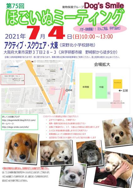 | イベント内容 | 7月4日(日)大阪府大東市の「アクティブ・スクウェア・大東」で、第75回ほごいぬミーティングを開催します。 保護犬を家族に迎えようと考えている方、保護犬に会ってみたい方、保護犬について知りたい方、ぜひご来場ください。 当日は、Dog's smileグッズやワンコ用品の販売、Dog's smileを応援してくださる方々が手作りされた手作り雑貨などの販売も行います。どれもお買い得です。 売り上げは、私たちの活動資金になります。ぜひご協力をお願いします。 なお、来場予定のワンコについては、活動ブログをご確認ください。 来場者のみなさまには、コロナウイルス感染拡大防止に御協力をお願いします。 ・必ずマスクを着用の上、御来場ください。 ・発熱・風邪の症状のある方の入場は御遠慮願います。 ・入口にて検温を行い、37.5℃以上の場合は、入場をお断りします。 ・来場者数により、入場制限を行う場合があります。 ・受付時に「大阪コロナ追跡システム」への御協力をお願いします。 日時 令和3年7月4日(日)午前10時~午後1時 場所 アクティブ・スクウェア・大東 大阪府大東市深野3丁目28-3 (JR学研都市線野崎駅から西に徒歩5分) 会場には有料駐車場がありますが、数に限りがあります。満車の場合は、近隣のコインパーキングの利用をお願いします。 |