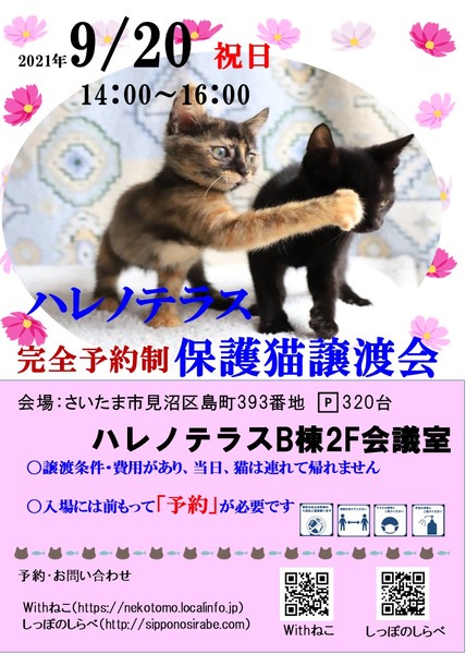 | イベント内容 | ☆★緊急事態宣言下のため 「完全予約制」とし、予約のないお客様の入場はできません★☆ 予めご了承ください。 【コロナ対策】ご来場の方はマスク着用をお願いいたします。 入場の際、検温・アルコール消毒・アンケートご記入をお願いしております 埼玉県さいたま市見沼区島町393番地 ハレノテラスB棟2F会議室(マツモトキヨシの横の階段を上がってください) 「ハレノテラス」はさいたま市見沼区にあるショッピングモールです ハレノテラスHP:http://hare-terra.com/ 【交通】 車をご利用の場合 東大宮バイパスからのルート 東大宮バイパスを北に進み、ガストの交差点を左折し、見沼区島町(ハレノテラス)へ 県道5号線(新産業道路)からのルート 県道5号線を北に進み、松屋の前を右折、さらに進みモスバーガーの前を右折し、見沼区島町(ハレノテラス)へ ※カーナビをご利用のお客様 〒337-0006 埼玉県さいたま市見沼区島町393番地とご入力ください 電車をご利用の場合 JR宇都宮線(東北本線)の東大宮駅東口より徒歩13分 バスをご利用の場合 JR宇都宮線東大宮駅東口より 国際興業バス「大和田駅行き」3分乗車 「東大宮7丁目」バス停 下車徒歩3分 東武野田線大和田駅 国際興業バス「東大宮駅行き」6分乗車 「東大宮7丁目」バス停下車 徒歩3分 ☆子猫からおとな猫ちゃん20匹以上おります。 ぜひ会いにいらしてください ☆猫を初めて飼うかたへのアドバイスも行っています。 ☆譲渡条件によってはトライアルもOKです ☆譲渡条件・費用は各保護主により異なりますのでお気軽にお問い合わせください 【里親希望の方へお願い】 ・当日猫は連れて帰れません 会場でお申込みいただき双方が合意した場合は 後日改めてご自宅へお届けいたします ・譲渡の際は 「譲渡契約書へのサイン」「身分確認」「医療費などの経費(譲渡費用)が必要となります」 【お問合わせ】※ご予約もこちらからお願いいたします Withねこ https://nekotomo.localinfo.jp 【主催】 Withねこ メールアドレス nekotomo2222@yahoo.co.jp ホームページ https://nekotomo.localinfo.jp しっぽのしらべ http://sipponosirabe.com/ |