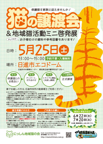 | イベント内容 | 5月25日(土)に「猫の譲渡会」を開催いたします。 猫少なめのミニ譲渡会&地域猫活動啓発展です。 日進市内で保護された猫さんたちがお待ちしております。 まだ猫を飼う予定のない方も、また、地域猫活動に興味のある方、猫でお困りの方もどうぞお気軽にお立ち寄りください!(^^)/ 【日時】2019年5月25日(土)13:00〜15:00 【会場】日進市エコドーム(中央環境センター) ※ご予約不要・入場無料です。 ※猫ちゃんの譲渡には条件がございます。詳細はホームページをご参照ください。 ※車でお越しの方は、日進市役所の駐車場をご利用ください(徒歩1分)。 ※エコドームの駐車場は、ごみを持参される方専用のため、利用できません。ごみの処分を兼ねてお立ち寄りくださる場合でも、誠にお手数ですが、ごみ処分後にお車を日進市役所の駐車場へ移動していただきますよう、どうぞご協力をお願いいたします。 【主催】にっしん地域猫の会 【ホームページ】http://nissinchiikineko.main.jp |