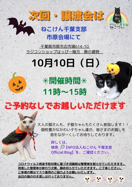| イベント内容 | 春から夏に生まれ、保護された沢山の子猫達。 元気にスクスク成長し、譲渡会に参加できる準備が整いました。 通常スタイルの譲渡会と致しますが、コロナウイルス対策として ・会場内ではマスクのご着用と入退室の際は消毒をお願い致します。 ・ご予約無しでお越しいただけますが、混雑時は整理券を配らせていただきます。 ご協力の程よろしくお願い致します。 成猫は指名制のお見合いとさせていただく子もおりますので、 『◯◯ちゃんと、お見合い希望』とご指名の事前申し込みをお願い致します。 ねこけん千葉支部のブログ内にありますお問い合わせフォームより、 ⚫︎お名前 ⚫︎ご住所(市区町村までで大丈夫です) ⚫︎お見合いご指名猫の名前を、お知らせください。 ※締め切りは譲渡会前日10月9日(土)18時までとなっております。 ねこけん千葉支部ブログ→ https://ameblo.jp/nekoken-chiba/ また、譲渡会会場では、千葉県内にお住いの預かりボランティアさん及びお世話ボランティアさんを募集しています。 ご希望の方は、大変お手数をおかけしますが、譲渡会までお越しください。 ※ご都合がつかない場合は、お問い合わせ先までご相談ください。 [日時] 10月10日(日)11:00~15:00 [会場] 千葉県市原市古市場614-10 ※屋内での開催となり雨天決行です。 ※抱っこもOK! ※猫ちゃんの負担も考え、ご来場は時間内にお願い致します。 ※特にご予約などは必要ございませんのでご家族皆様でぜひお越し下さい。 ※駐車場あり。 [交通] 交通機関を利用してお越しの方 JR内房線 浜野駅より徒歩13分 浜野駅は、東京駅から京葉線→内房線でおよそ50分の距離!! お車でお越しの方 京葉道路蘇我インターより車で10分 ※駐車場はラジコンショップハッピー様裏手にございます駐車場をご利用ください [譲渡ご希望の方へのお願い] 誠に恐れ入りますが下記に当てはまります方への譲渡は不可となりますので予めご了承下さい。 ①学生さん、未成年の方、安定収入のない方 ②ペットを飼う事を許されていない住宅にお住まいの方 ③身体的、精神的疾病で治療中の方 ※60歳以上の方は別途条件がございますのでご相談下さい。 [譲渡の流れ] お申込み→審査→後日お届け→トライアル→正式譲渡 ※当日のお連れ帰りは出来ませんので予めご了承ください。 ※仮譲渡時にご希望の猫ちゃんにかかった医療費(血液検査・ワクチン・駆虫・不妊去勢手術等)をご負担願います。 しかし、正式譲渡に至らなかった場合は医療費を全額返済致します。 [主催] 動物愛護団体 NPO法人ねこけん 千葉支部 [ブログ] https://ameblo.jp/nekoken-chiba/ [参加動物] 成猫・子猫(ねこけん保護猫以外の猫ちゃんも参加予定です) [お問い合わせ] ご不明な点、ご質問等ございましたら下記までお問い合わせください。 chiba.info@nekoken.jp |