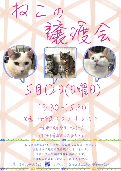 | イベント内容 | 個人ボラさんが愛情をかけて保護している大きな猫ちゃんや小さな猫ちゃんたちが ずっとのお家を求めて集まります。 ねこを家族に迎えたいとお考えの方 会場はアットホームな雰囲気ですので どうぞお気軽にご来場くださいね。 *里親さまの選定は先着順ではありません。 *保護主により譲渡条件は異なります。 *当日ねこちゃんを連れて帰ることは出来ません。 後日 保護主が里親様宅へお届けいたします。 *里親様に医療費のご負担をお願いしております。 第12回 Life With Cat『ねこの譲渡会』 5月12日(日曜日) 13:30~15:30 <会場> レンタルスタジオレモン 260-0033 千葉市中央区春日1丁目21-5 (JR西千葉駅/京成西登戸駅より徒歩4分) *駐車場のご用意はございません。 スタジオより徒歩1分圏内にコインパーキングが多数ありますので そちらをご利用ください。 ブログ→https://ameblo.jp/lifewithcat2018/ Facebook→https://www.facebook.com/lifewithcat2018/ メールでのお問い合わせ→lifewithcat2018@gmail.com |
