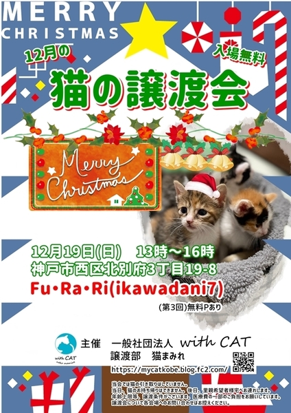 | イベント内容 | 猫の譲渡会 12月19日(日)13時~16時 神戸市西区北別府3丁目19-8 Fu・Ra・Ri(ikawadani7)無料パーキングあります 可愛い猫たちがたくさん参加していますので是非ご参加ください 参加のねこさんたちはブログにて掲載しています https://mycatkobe.blog.fc2.com/ 主催 一般社団法人 with CAT(譲渡部 猫まみれ) |